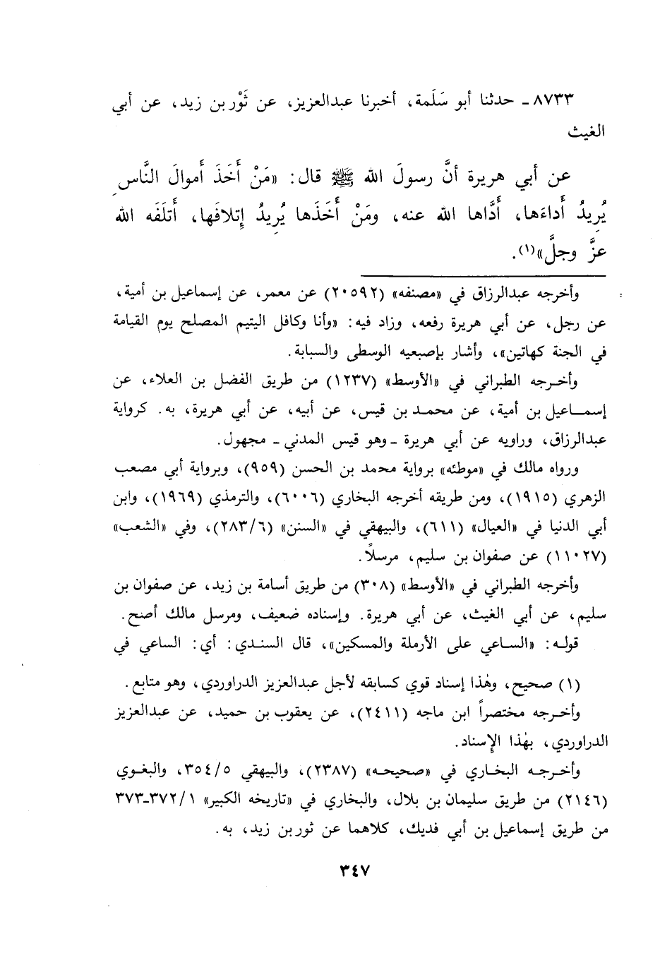 ٨٧٣٣ - حَدَّثَنَا أَبُو سَلَمَةَ، أَخْبَرَنَا عَبْدُ الْعَزِيزِ، عَنْ ثَوْرِ بْنِ زَيْدٍ، عَنْ أَبِي الْغَيْثِ، عَنْ أَبِي هُرَيْرَةَ، أَنَّ رَسُولَ اللهِ صَلَّى اللهُ عَلَيْهِ وَسَلَّمَ، قَالَ: " مَنْ أَخَذَ أَمْوَالَ النَّاسِ يُرِيدُ أَدَاءَهَا، أَدَّاهَا اللهُ عَنْهُ، وَمَنْ أَخَذَهَا يُرِيدُ إِتْلَافَهَا، أَتْلَفَهُ اللهُ عَزَّ وَجَلَّ " (١)