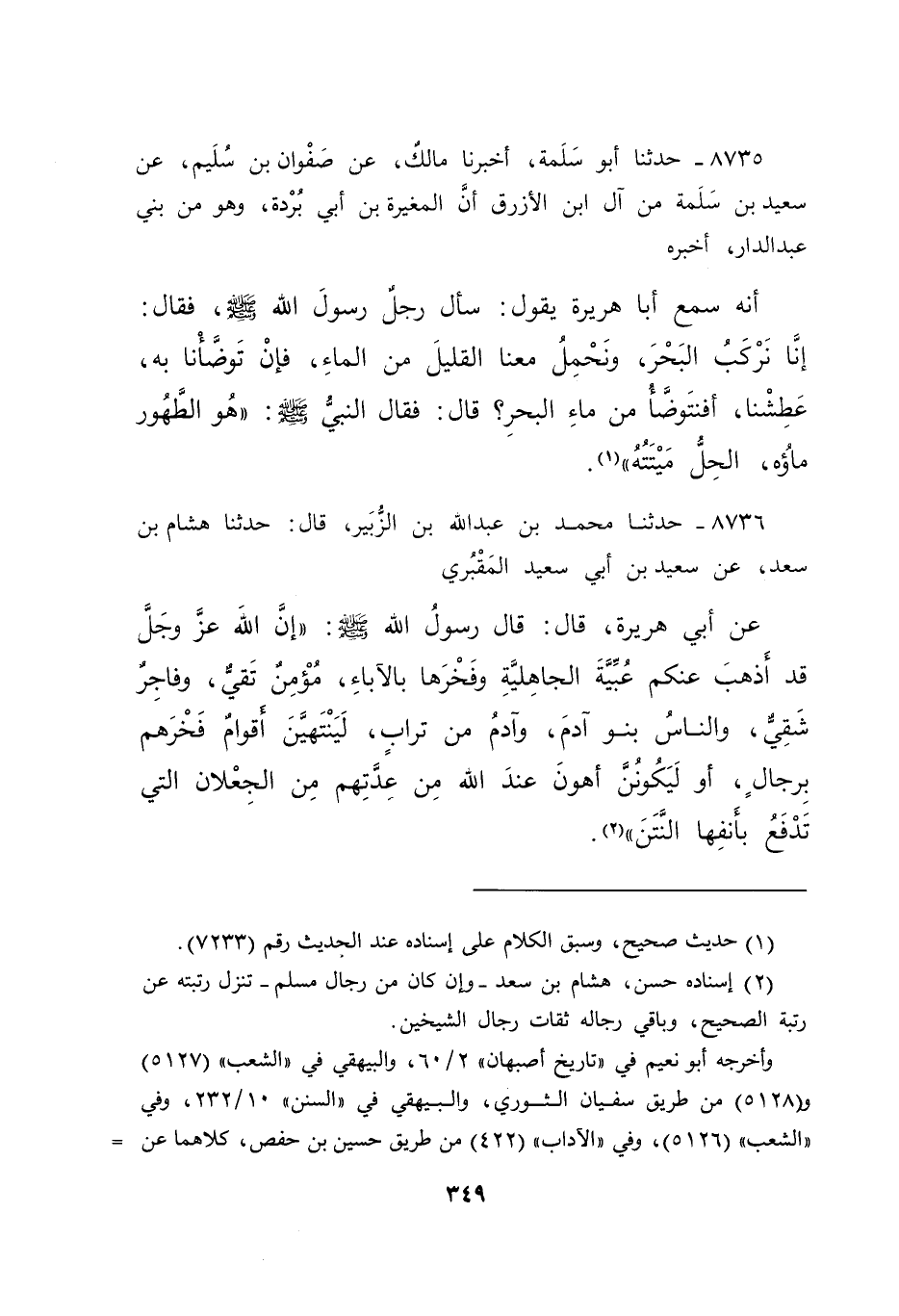 ٨٧٣٥ - حَدَّثَنَا أَبُو سَلَمَةَ، أَخْبَرَنَا مَالِكٌ، عَنْ صَفْوَانَ بْنِ سُلَيْمٍ، عَنْ سَعِيدِ بْنِ سَلَمَةَ - مِنْ آلِ ابْنِ الْأَزْرَقِ - أَنَّ الْمُغِيرَةَ بْنَ أَبِي بُرْدَةَ - وَهُوَ مِنْ بَنِي عَبْدِ الدَّارِ - أَخْبَرَهُ أَنَّهُ سَمِعَ أَبَا هُرَيْرَةَ، يَقُولُ: سَأَلَ رَجُلٌ رَسُولَ اللهِ صَلَّى اللهُ عَلَيْهِ وَسَلَّمَ، فَقَالَ: " إِنَّا نَرْكَبُ الْبَحْرَ، وَنَحْمِلُ مَعَنَا الْقَلِيلَ مِنَ الْمَاءِ، فَإِنْ تَوَضَّأْنَا بِهِ عَطِشْنَا، أَفَنَتَوَضَّأُ مِنْ مَاءِ الْبَحْرِ؟ قَالَ: فَقَالَ النَّبِيُّ صَلَّى اللهُ عَلَيْهِ وَسَلَّمَ: " هُوَ الطَّهُورُ مَاؤُهُ، الْحِلُّ مَيْتَتُهُ " (١)