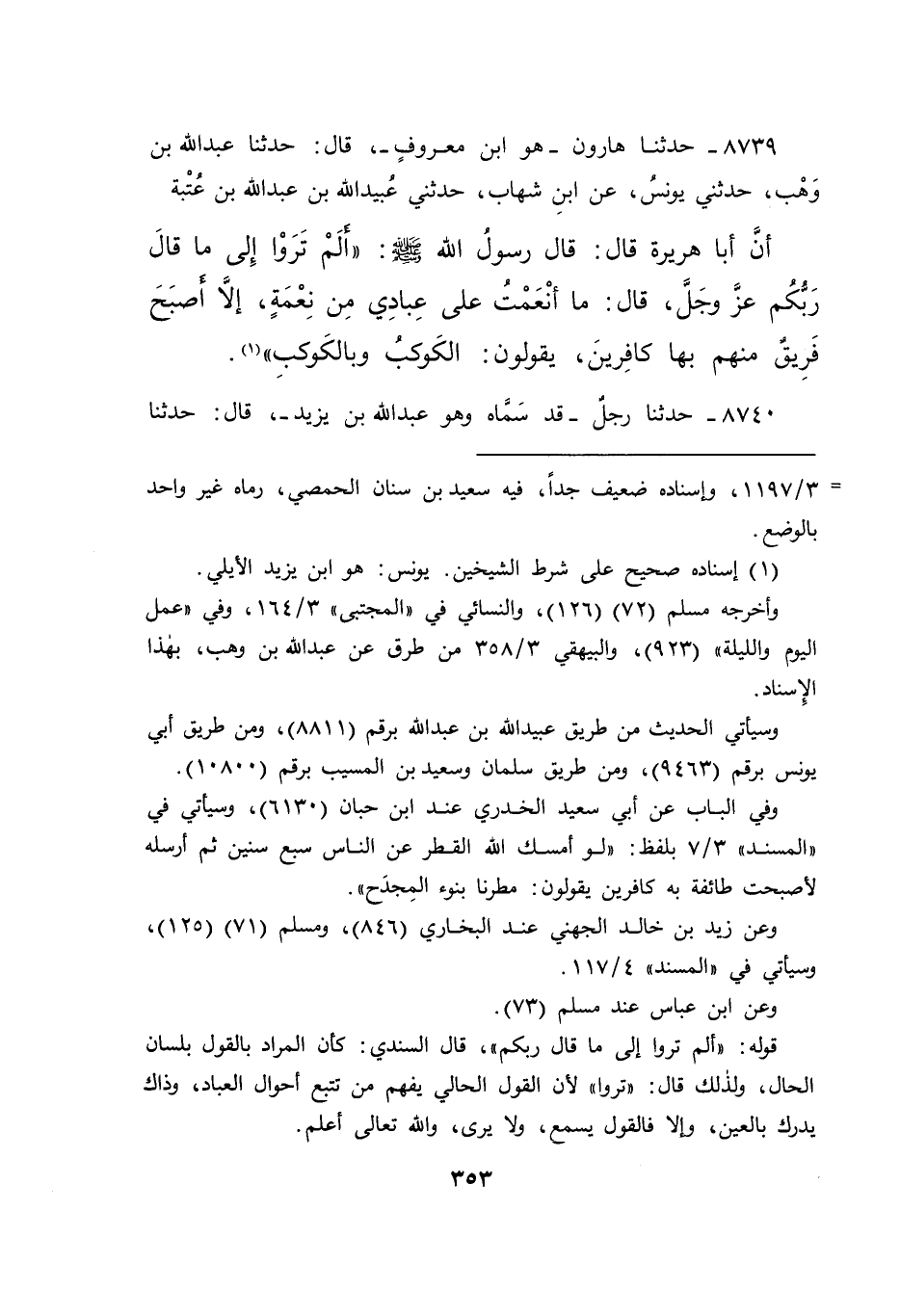 ٨٧٣٩ - حَدَّثَنَا هَارُونُ هُوَ ابْنُ مَعْرُوفٍ، قَالَ: حَدَّثَنَا عَبْدُ اللهِ بْنُ وَهْبٍ، حَدَّثَنِي يُونُسُ، عَنِ ابْنِ شِهَابٍ، حَدَّثَنِي عُبَيْدُ اللهِ بْنُ عَبْدِ اللهِ بْنِ عُتْبَةَ، أَنَّ أَبَا هُرَيْرَةَ، قَالَ: قَالَ رَسُولُ اللهِ صَلَّى اللهُ عَلَيْهِ وَسَلَّمَ: " أَلَمْ تَرَوْا إِلَى مَا قَالَ رَبُّكُمْ عَزَّ وَجَلَّ، قَالَ: مَا أَنْعَمْتُ عَلَى عِبَادِي مِنْ نِعْمَةٍ، إِلَّا أَصْبَحَ فَرِيقٌ مِنْهُمْ بِهَا كَافِرِينَ، يَقُولُونَ: الْكَوْكَبُ وَبِالْكَوْكَبِ " (١)