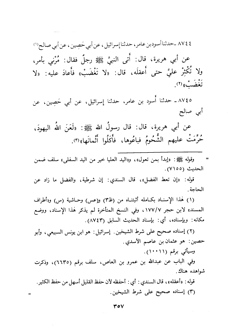 ٨٧٤٤ - حَدَّثَنَا أَسْوَدُ بْنُ عَامِرٍ , حَدَّثَنَا إِسْرَائِيلُ , عَنْ أَبِي حَصِينٍ , عَنْ أَبِي صَالِحٍ (١) عَنْ أَبِي هُرَيْرَةَ، قَالَ: أَتَى النَّبِيَّ صَلَّى اللهُ عَلَيْهِ وَسَلَّمَ رَجُلٌ، فَقَالَ: مُرْنِي بِأَمْرٍ، وَلَا تُكْثِرْ عَلَيَّ حَتَّى أَعْقِلَهُ، قَالَ: " لَا تَغْضَبْ "، فَأَعَادَ عَلَيْهِ: " لَا تَغْضَبْ " (٢)