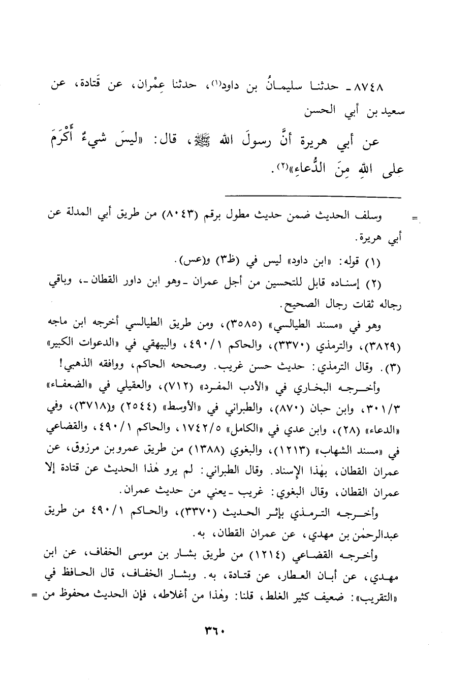 ٨٧٤٨ - حَدَّثَنَا سُلَيْمَانُ بْنُ دَاوُدَ (١) ، حَدَّثَنَا عِمْرَانُ، عَنْ قَتَادَةَ، عَنْ سَعِيدِ بْنِ أَبِي الْحَسَنِ، عَنْ أَبِي هُرَيْرَةَ، أَنَّ رَسُولَ اللهِ صَلَّى اللهُ عَلَيْهِ وَسَلَّمَ، قَالَ: " لَيْسَ شَيْءٌ أَكْرَمَ عَلَى اللهِ مِنَ الدُّعَاءِ " (٢)