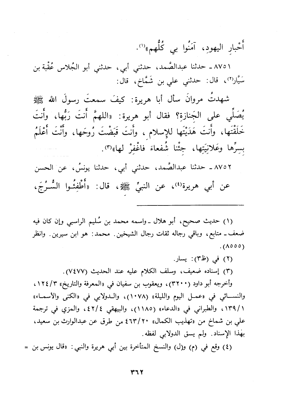 ٨٧٥١ - حَدَّثَنَا عَبْدُ الصَّمَدِ، حَدَّثَنِي أَبِي، حَدَّثَنِي أَبُو الْجُلَاسِ عُقْبَةُ بْنُ سَيَّارٍ (٢) ، قَالَ: حَدَّثَنِي عَلِيُّ بْنُ شَمَّاخٍ، قَالَ: شَهِدْتُ مَرْوَانَ سَأَلَ أَبَا هُرَيْرَةَ، كَيْفَ سَمِعْتَ رَسُولَ اللهِ صَلَّى اللهُ عَلَيْهِ وَسَلَّمَ يُصَلِّي عَلَى الْجِنَازَةِ؟ فَقَالَ أَبُو هُرَيْرَةَ: " اللهُمَّ أَنْتَ رَبُّهَا، وَأَنْتَ خَلَقْتَهَا، وَأَنْتَ هَدَيْتَهَا لِلْإِسْلَامِ، وَأَنْتَ قَبَضْتَ رُوحَهَا، وَأَنْتَ أَعْلَمُ بِسِرِّهَا، وَعَلَانِيَتِهَا، جِئْنَا شُفَعَاءَ فَاغْفِرْ لَهَا " (٣)