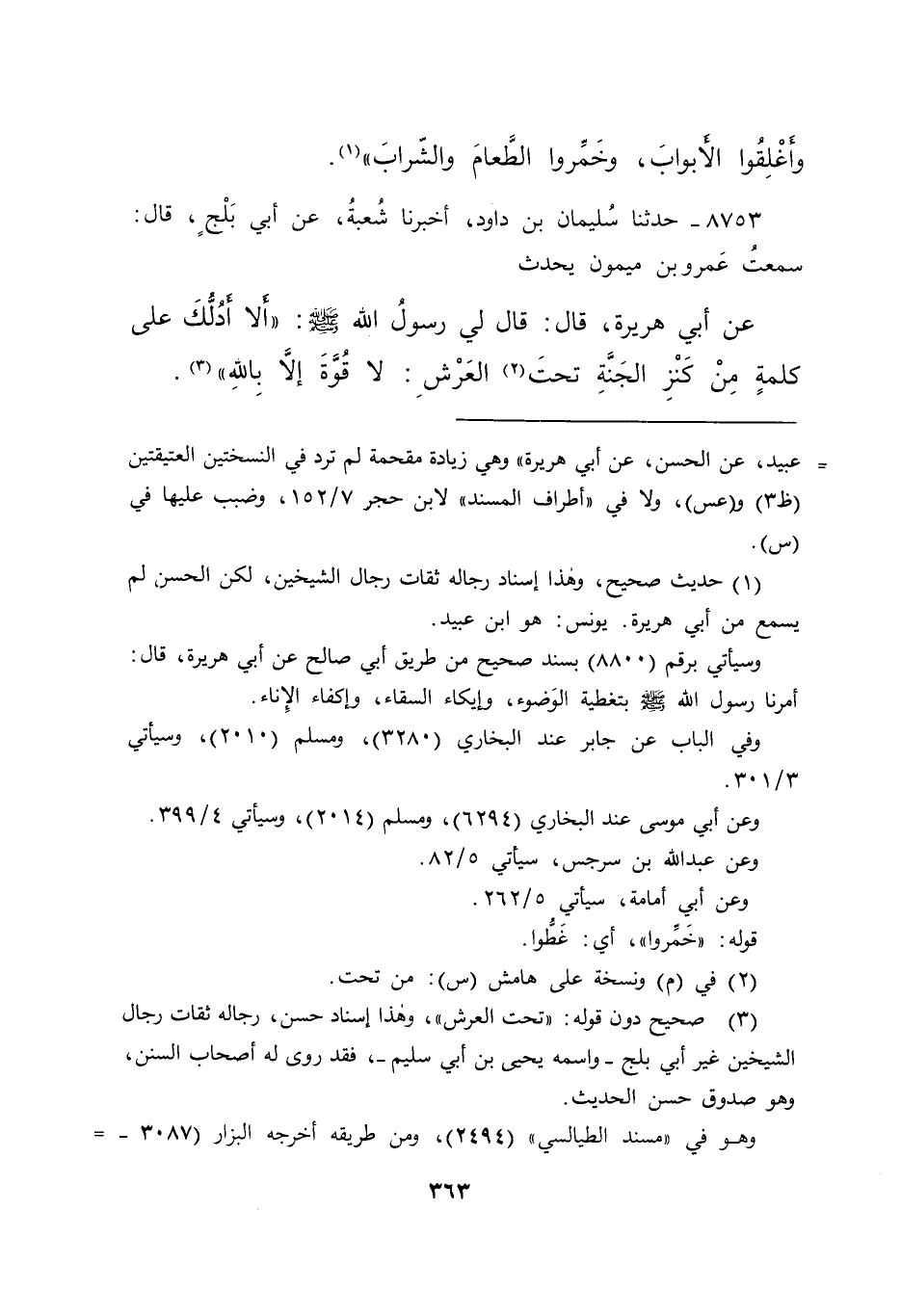 ٨٧٥٣ - حَدَّثَنَا سُلَيْمَانُ بْنُ دَاوُدَ، أَخْبَرَنَا شُعْبَةُ، عَنْ أَبِي بَلْجٍ، قَالَ: سَمِعْتُ عَمْرَو بْنَ مَيْمُونٍ، يُحَدِّثُ عَنْ أَبِي هُرَيْرَةَ، قَالَ: قَالَ لِي رَسُولُ اللهِ صَلَّى اللهُ عَلَيْهِ وَسَلَّمَ: " أَلَا أَدُلُّكَ عَلَى كَلِمَةٍ مِنْ كَنْزِ الْجَنَّةِ تَحْتَ (٢) الْعَرْشِ: لَا قُوَّةَ إِلَّا بِاللهِ " (٣)