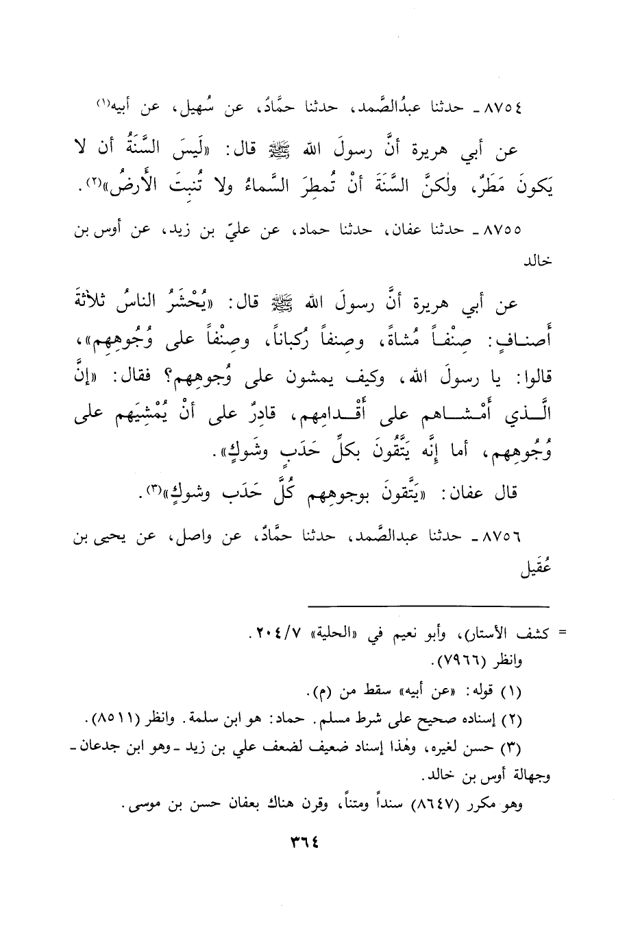 ٨٧٥٥ - حَدَّثَنَا عَفَّانُ، حَدَّثَنَا حَمَّادٌ، عَنْ عَلِيِّ بْنِ زَيْدٍ، عَنْ أَوْسِ بْنِ خَالِدٍ، عَنْ أَبِي هُرَيْرَةَ، أَنَّ رَسُولَ اللهِ صَلَّى اللهُ عَلَيْهِ وَسَلَّمَ، قَالَ: " يُحْشَرُ النَّاسُ ثَلَاثَةَ أَصْنَافٍ: صِنْفًا مُشَاةً، وَصِنْفًا رُكْبَانًا، وَصِنْفًا عَلَى وُجُوهِهِمْ " قَالُوا: يَا رَسُولَ اللهِ، وَكَيْفَ يَمْشُونَ عَلَى وُجُوهِهِمْ؟ فَقَالَ: " إِنَّ الَّذِي أَمْشَاهُمْ عَلَى أَقْدَامِهِمْ، قَادِرٌ عَلَى أَنْ يُمْشِيَهُمْ عَلَى وُجُوهِهِمْ، أَمَا إِنَّهُ يَتَّقُونَ بِكُلِّ حَدَبٍ وَشَوْكٍ " قَالَ عَفَّانُ: " يَتَّقُونَ بِوُجُوهِهِمْ كُلَّ حَدَبٍ وَشَوْكٍ " (٣)