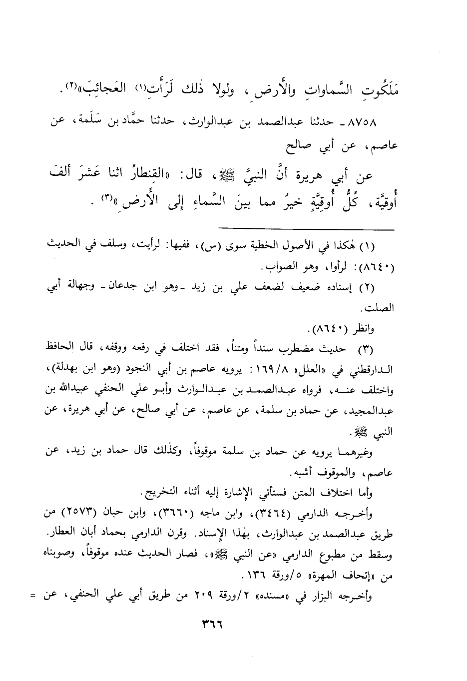 ٨٧٥٨ - حَدَّثَنَا عَبْدُ الصَّمَدِ بْنُ عَبْدِ الْوَارِثِ، حَدَّثَنَا حَمَّادُ بْنُ سَلَمَةَ، عَنْ عَاصِمٍ، عَنْ أَبِي صَالِحٍ، عَنْ أَبِي هُرَيْرَةَ، أَنَّ النَّبِيَّ صَلَّى اللهُ عَلَيْهِ وَسَلَّمَ، قَالَ: " الْقِنْطَارُ اثْنَا عَشَرَ أَلْفَ أُوقِيَّةٍ، كُلُّ أُوقِيَّةٍ خَيْرٌ مِمَّا بَيْنَ السَّمَاءِ إِلَى الْأَرْضِ " (٣)
