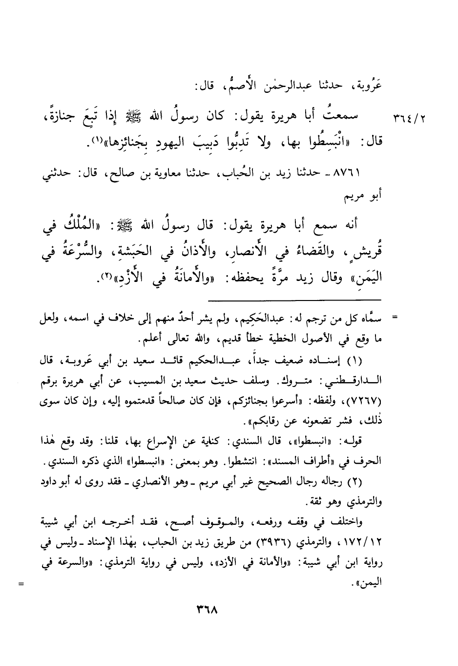 عَرُوبَةَ، حَدَّثَنَا عَبْدُ الرَّحْمَنِ الْأَصَمُّ، قَالَ: سَمِعْتُ أَبَا هُرَيْرَةَ، يَقُولُ: كَانَ رَسُولُ اللهِ صَلَّى اللهُ عَلَيْهِ وَسَلَّمَ إِذَا تَبِعَ جَنَازَةً، قَالَ: " انْبَسِطُوا بِهَا، وَلَا تَدِبُّوا دَبِيبَ الْيَهُودِ بِجَنَائِزِهَا " (١)