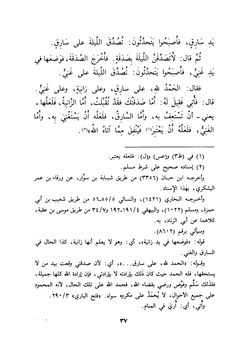 يَدِ سَارِقٍ، فَأَصْبَحُوا يَتَحَدَّثُونَ: تُصُدِّقَ اللَّيْلَةَ عَلَى سَارِقٍ. ثُمَّ قَالَ: لَأَتَصَدَّقَنَّ اللَّيْلَةَ بِصَدَقَةٍ. فَأَخْرَجَ الصَّدَقَةَ، فَوَضَعَهَا فِي يَدِ غَنِيٍّ، فَأَصْبَحُوا يَتَحَدَّثُونَ: تُصُدِّقَ اللَّيْلَةَ عَلَى غَنِيٍّ ". فَقَالَ: " الْحَمْدُ لِلَّهِ، عَلَى سَارِقٍ، وَعَلَى زَانِيَةٍ، وَعَلَى غَنِيٍّ ". قَالَ: " فَأُتِيَ فَقِيلَ لَهُ: أَمَّا صَدَقَتُكَ فَقَدْ تُقُبِّلَتْ، أَمَّا الزَّانِيَةُ، فَلَعَلَّهَا - يَعْنِي - أَنْ تَسْتَعِفَّ بِهِ، وَأَمَّا السَّارِقُ، فَلَعَلَّهُ أَنْ يَسْتَغْنِيَ بِهِ، وَأَمَّا الْغَنِيُّ، فَلَعَلَّهُ أَنْ يَعْتَبِرَ (١) فَيُنْفِقَ مِمَّا آتَاهُ اللهُ " (٢)