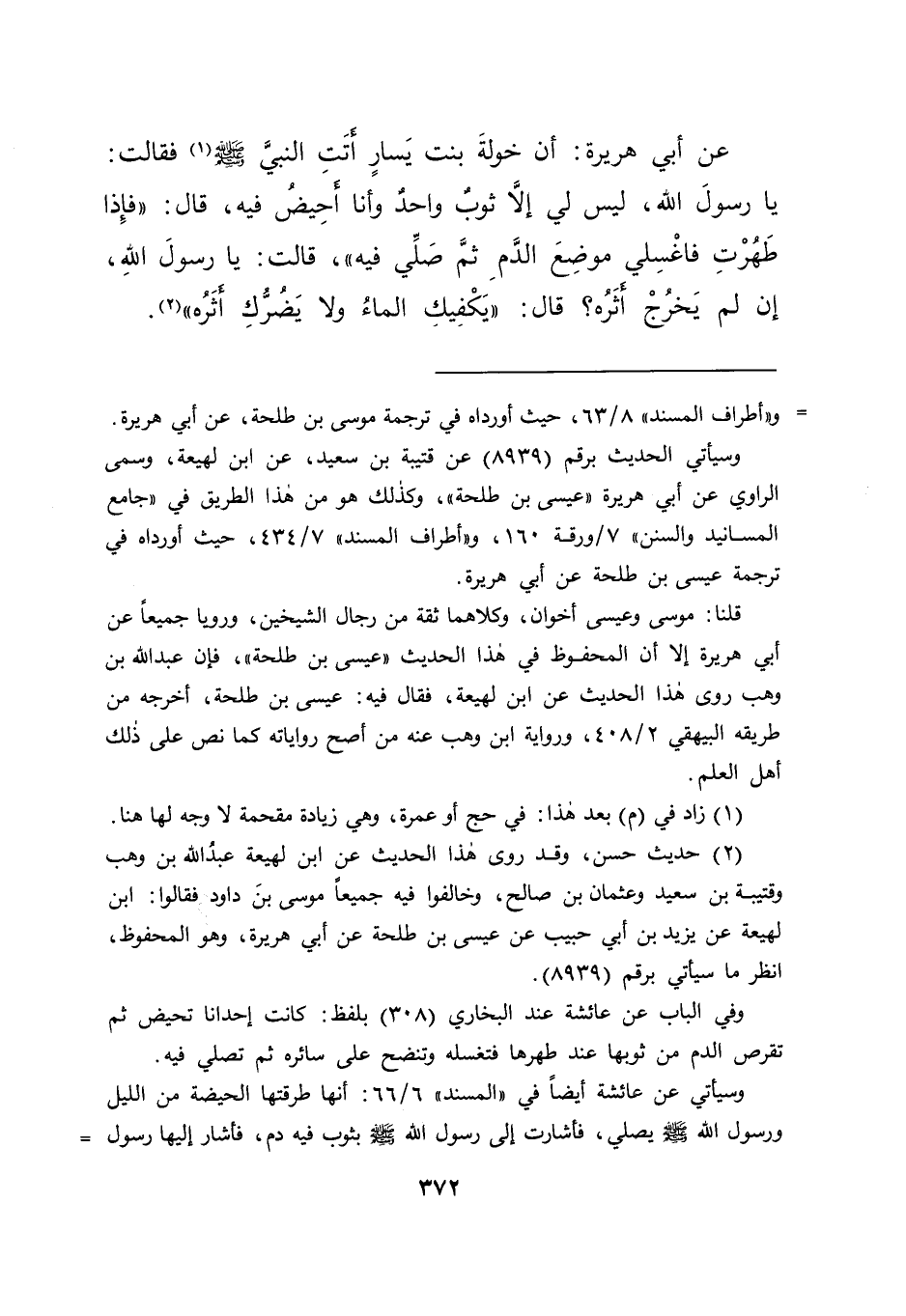 عَنْ أَبِي هُرَيْرَةَ، أَنَّ خَوْلَةَ بِنْتَ يَسَارٍ أَتَتِ النَّبِيَّ صَلَّى اللهُ عَلَيْهِ وَسَلَّمَ (١) ، فَقَالَتْ: يَا رَسُولَ اللهِ، لَيْسَ لِي إِلَّا ثَوْبٌ وَاحِدٌ، وَأَنَا أَحِيضُ فِيهِ، قَالَ: " فَإِذَا طَهُرْتِ فَاغْسِلِي مَوْضِعَ الدَّمِ، ثُمَّ صَلِّي فِيهِ "، قَالَتْ: يَا رَسُولَ اللهِ، إِنْ لَمْ يَخْرُجْ أَثَرُهُ، قَالَ: " يَكْفِيكِ الْمَاءُ، وَلَا يَضُرُّكِ أَثَرُهُ " (٢)