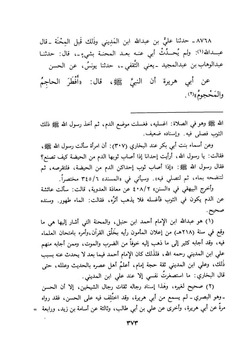٨٧٦٨ - حَدَّثَنَا عَلِيُّ بْنُ عَبْدِ اللهِ ابْنُ الْمَدِينِيِّ - وَذَلِكَ قَبْلَ الْمِحْنَةِ - قَالَ عَبْدُ اللهِ (١) : " وَلَمْ يُحَدِّثْ أَبِي عَنْهُ بَعْدَ الْمِحْنَةِ بِشَيْءٍ "، قَالَ: حَدَّثَنَا عَبْدُ الْوَهَّابِ بْنُ عَبْدِ الْمَجِيدِ يَعْنِي الثَّقَفِيَّ، حَدَّثَنَا يُونُسُ، عَنِ الْحَسَنِ، عَنْ أَبِي هُرَيْرَةَ، أَنَّ النَّبِيَّ صَلَّى اللهُ عَلَيْهِ وَسَلَّمَ، قَالَ: " أَفْطَرَ الْحَاجِمُ وَالْمَحْجُومُ " (٢)