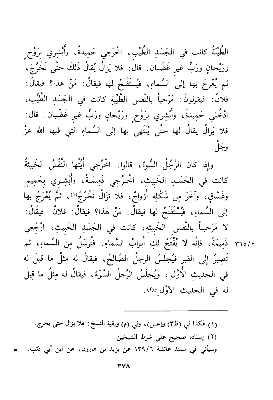 الطَّيِّبَةُ، كَانَتْ فِي الْجَسَدِ الطَّيِّبِ، اخْرُجِي حَمِيدَةً، وَأَبْشِرِي بِرَوْحٍ، وَرَيْحَانٍ، وَرَبٍّ غَيْرِ غَضْبَانَ "، قَالَ: " فَلَا يَزَالُ يُقَالُ ذَلِكَ حَتَّى تَخْرُجَ، ثُمَّ يُعْرَجَ بِهَا إِلَى السَّمَاءِ، فَيُسْتَفْتَحُ لَهَا، فَيُقَالُ: مَنْ هَذَا؟ فَيُقَالُ: فُلَانٌ، فَيَقُولُونَ: مَرْحَبًا بِالنَّفْسِ الطَّيِّبَةِ، كَانَتْ فِي الْجَسَدِ الطَّيِّبِ، ادْخُلِي حَمِيدَةً، وَأَبْشِرِي بِرَوْحٍ، وَرَيْحَانٍ، وَرَبٍّ غَيْرِ غَضْبَانَ " قَالَ: " فَلَا يَزَالُ يُقَالُ لَهَا حَتَّى يُنْتَهَى بِهَا إِلَى السَّمَاءِ الَّتِي فِيهَا اللهُ عَزَّ وَجَلَّ، وَإِذَا كَانَ الرَّجُلُ السَّوْءُ، قَالُوا: اخْرُجِي أَيَّتُهَا النَّفْسُ الْخَبِيثَةُ، كَانَتْ فِي الْجَسَدِ الْخَبِيثِ، اخْرُجِي ذَمِيمَةً، وأَبْشِرِي بِحَمِيمٍ وَغَسَّاقٍ، وَآخَرَ مِنْ شَكْلِهِ أَزْوَاجٍ، فَلَا تَزَالُ تَخْرُجُ (١) ، ثُمَّ يُعْرَجَ بِهَا إِلَى السَّمَاءِ، فَيُسْتَفْتَحُ لَهَا، فَيُقَالُ: مَنْ هَذَا؟ فَيُقَالُ: فُلَانٌ، فَيُقَالُ: لَا مَرْحَبًا بِالنَّفْسِ الْخَبِيثَةِ، كَانَتْ فِي الْجَسَدِ الْخَبِيثِ، ارْجِعِي ذَمِيمَةً، فَإِنَّهُ لَا يُفْتَحُ لَكِ أَبْوَابُ السَّمَاءِ، فَتُرْسَلُ مِنَ السَّمَاءِ، ثُمَّ تَصِيرُ إِلَى الْقَبْرِ، فَيُجْلَسُ الرَّجُلُ الصَّالِحُ، فَيُقَالُ لَهُ: مِثْلُ مَا قِيلَ لَهُ فِي الْحَدِيثِ الْأَوَّلِ، وَيُجْلَسُ الرَّجُلُ السَّوْءُ، فَيُقَالُ لَهُ مِثْلُ مَا قِيلَ لَهُ فِي الْحَدِيثِ الْأَوَّلِ " (٢)