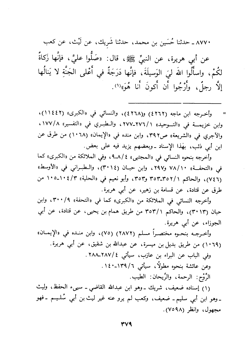 ٨٧٧٠ - حَدَّثَنَا حُسَيْنُ بْنُ مُحَمَّدٍ، حَدَّثَنَا شَرِيكٌ، عَنْ لَيْثٍ، عَنْ كَعْبٍ، عَنْ أَبِي هُرَيْرَةَ، عَنِ النَّبِيِّ صَلَّى اللهُ عَلَيْهِ وَسَلَّمَ قَالَ: " صَلُّوا عَلَيَّ فَإِنَّهَا زَكَاةٌ لَكُمْ، وَاسْأَلُوا اللهَ لِي الْوَسِيلَةَ، فَإِنَّهَا دَرَجَةٌ فِي أَعَلَى الْجَنَّةِ، لَا يَنَالُهَا إِلَّا رَجُلٌ، وَأَرْجُو أَنْ أَكُونَ أَنَا هُوَ " (١)