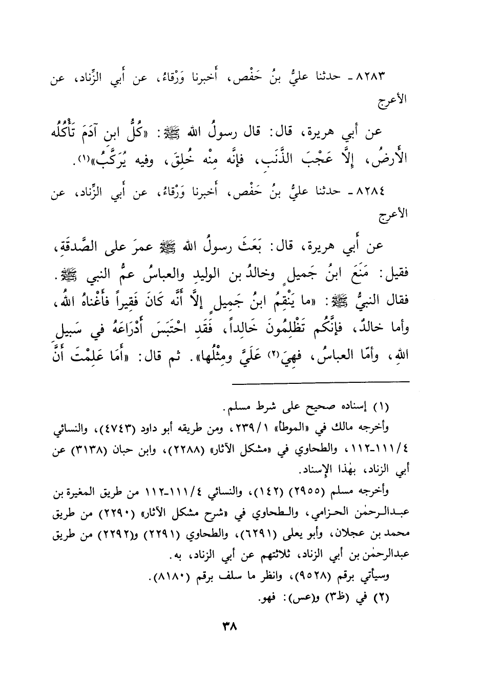 ٨٢٨٤ - حَدَّثَنَا عَلِيُّ بْنُ حَفْصٍ، أَخْبَرَنَا وَرْقَاءُ، عَنْ أَبِي الزِّنَادِ، عَنِ الْأَعْرَجِ، عَنْ أَبِي هُرَيْرَةَ، قَالَ: بَعَثَ رَسُولُ اللهِ صَلَّى اللهُ عَلَيْهِ وَسَلَّمَ عُمَرَ عَلَى الصَّدَقَةِ، فَقِيلَ: مَنَعَ ابْنُ جَمِيلٍ وَخَالِدُ بْنُ الْوَلِيدِ وَالْعَبَّاسُ عَمُّ النَّبِيِّ صَلَّى اللهُ عَلَيْهِ وَسَلَّمَ. فَقَالَ النَّبِيُّ صَلَّى اللهُ عَلَيْهِ وَسَلَّمَ: " مَا يَنْقِمُ ابْنُ جَمِيلٍ إِلَّا أَنَّهُ كَانَ فَقِيرًا فَأَغْنَاهُ اللهُ، وَأَمَّا خَالِدٌ، فَإِنَّكُمْ تَظْلِمُونَ خَالِدًا، فَقَدِ احْتَبَسَ أَدْرَاعَهُ فِي سَبِيلِ اللهِ، وَأَمَّا الْعَبَّاسُ فَهِيَ (٢) عَلَيَّ وَمِثْلُهَا ". ثُمَّ قَالَ: " أَمَا عَلِمْتَ أَنَّ