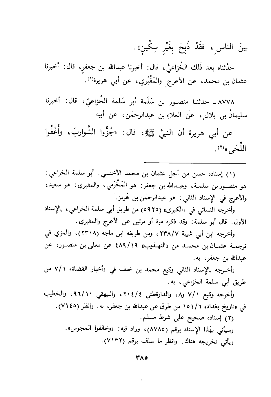 ٨٧٧٨ - حَدَّثَنَا مَنْصُورُ بْنُ سَلَمَةَ أَبُو سَلَمَةَ الْخُزَاعِيُّ، قَالَ: أَخْبَرَنَا سُلَيْمَانُ بْنُ بِلَالٍ، عَنِ الْعَلَاءِ بْنِ عَبْدِ الرَّحْمَنِ، عَنْ أَبِيهِ، عَنْ أَبِي هُرَيْرَةَ، أَنَّ النَّبِيَّ صَلَّى اللهُ عَلَيْهِ وَسَلَّمَ، قَالَ: " جُزُّوا الشَّوَارِبَ، وَاعْفُوا اللِّحَى " (٢)