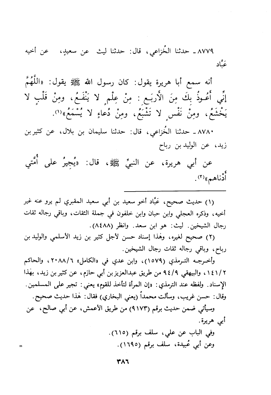 ٨٧٧٩ - حَدَّثَنَا الْخُزَاعِيُّ، قَالَ: حَدَّثَنَا لَيْثٌ، عَنْ سَعِيدٍ، عَنْ أَخِيهِ عَبَّادٍ، أَنَّهُ سَمِعَ أَبَا هُرَيْرَةَ، يَقُولُ: كَانَ رَسُولُ اللهِ صَلَّى اللهُ عَلَيْهِ وَسَلَّمَ يَقُولُ: " اللهُمَّ إِنِّي أَعُوذُ بِكَ مِنَ الْأَرْبَعِ: مِنْ عِلْمٍ لَا يَنْفَعُ، وَمِنْ قَلْبٍ لَا يَخْشَعُ، وَمِنْ نَفْسٍ لَا تَشْبَعُ، وَمِنْ دُعَاءٍ لَا يُسْمَعُ " (١)