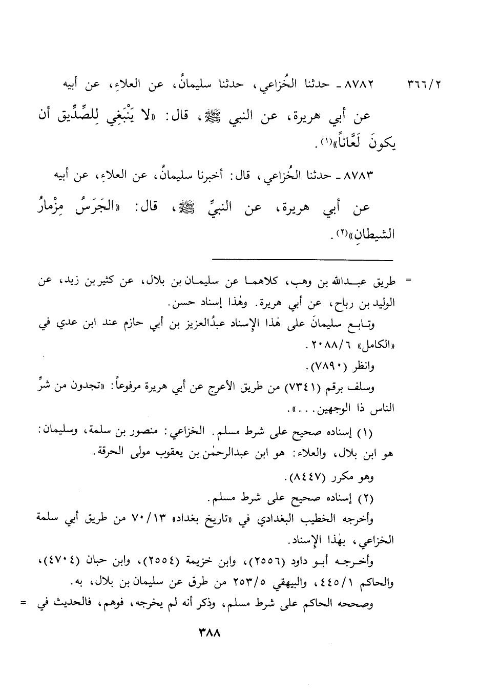 ٨٧٨٢ - حَدَّثَنَا الْخُزَاعِيُّ، حَدَّثَنَا سُلَيْمَانُ، عَنِ الْعَلَاءِ، عَنْ أَبِيهِ، عَنْ أَبِي هُرَيْرَةَ، عَنِ النَّبِيِّ صَلَّى اللهُ عَلَيْهِ وَسَلَّمَ قَالَ: " لَا يَنْبَغِي لِلصَّدِيقِ أَنْ يَكُونَ لَعَّانًا " (١)