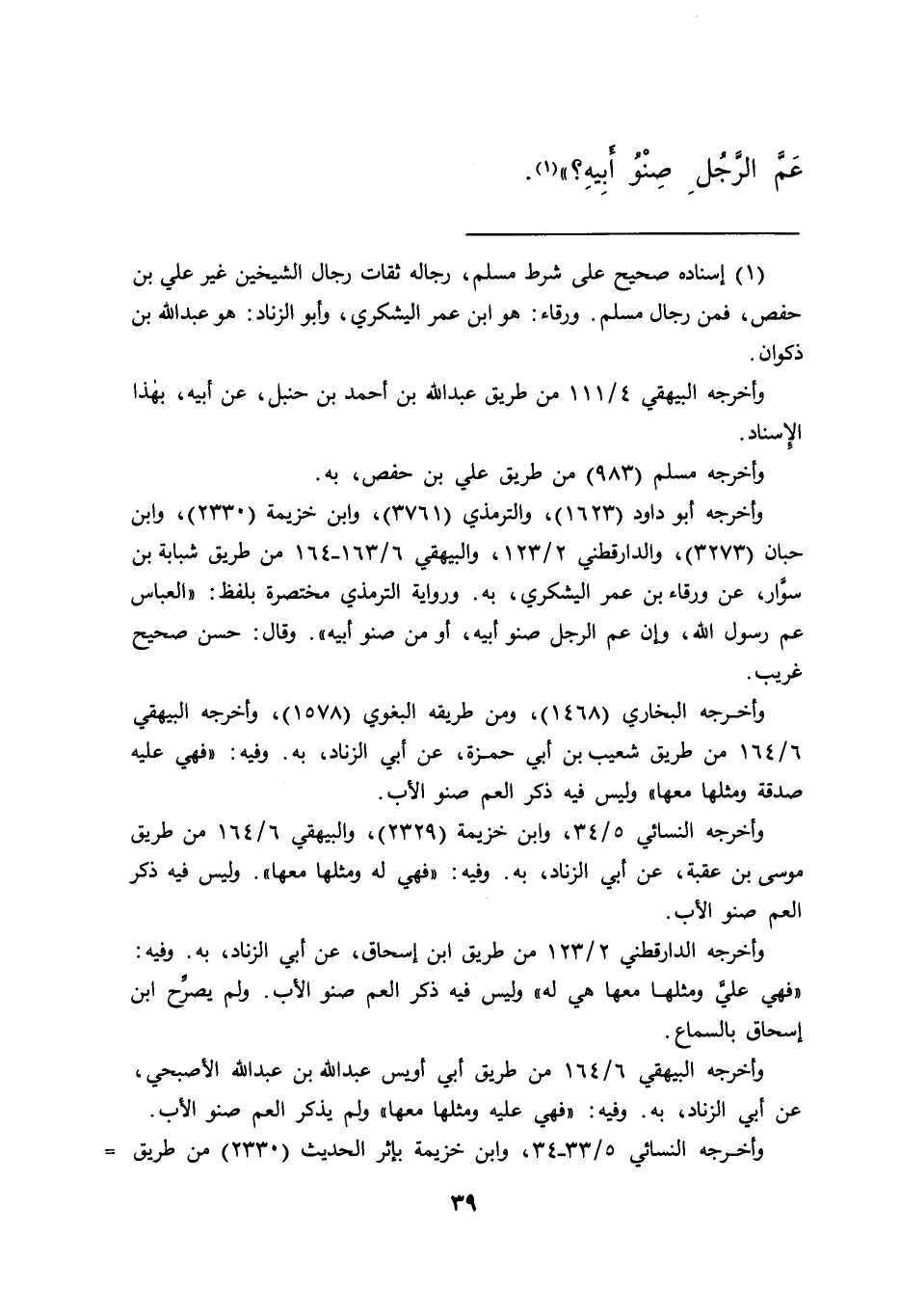 وأخرجه النسائي ٥/٣٤، وابن خزيمة (٢٣٢٩) ، والبيهقي ٦/١٦٤ من طريق موسى بن عقبة، عن أبي الزناد، به. وفيه: "فهي له ومثلها معها". وليس فيه ذكر العم صنو الأب.