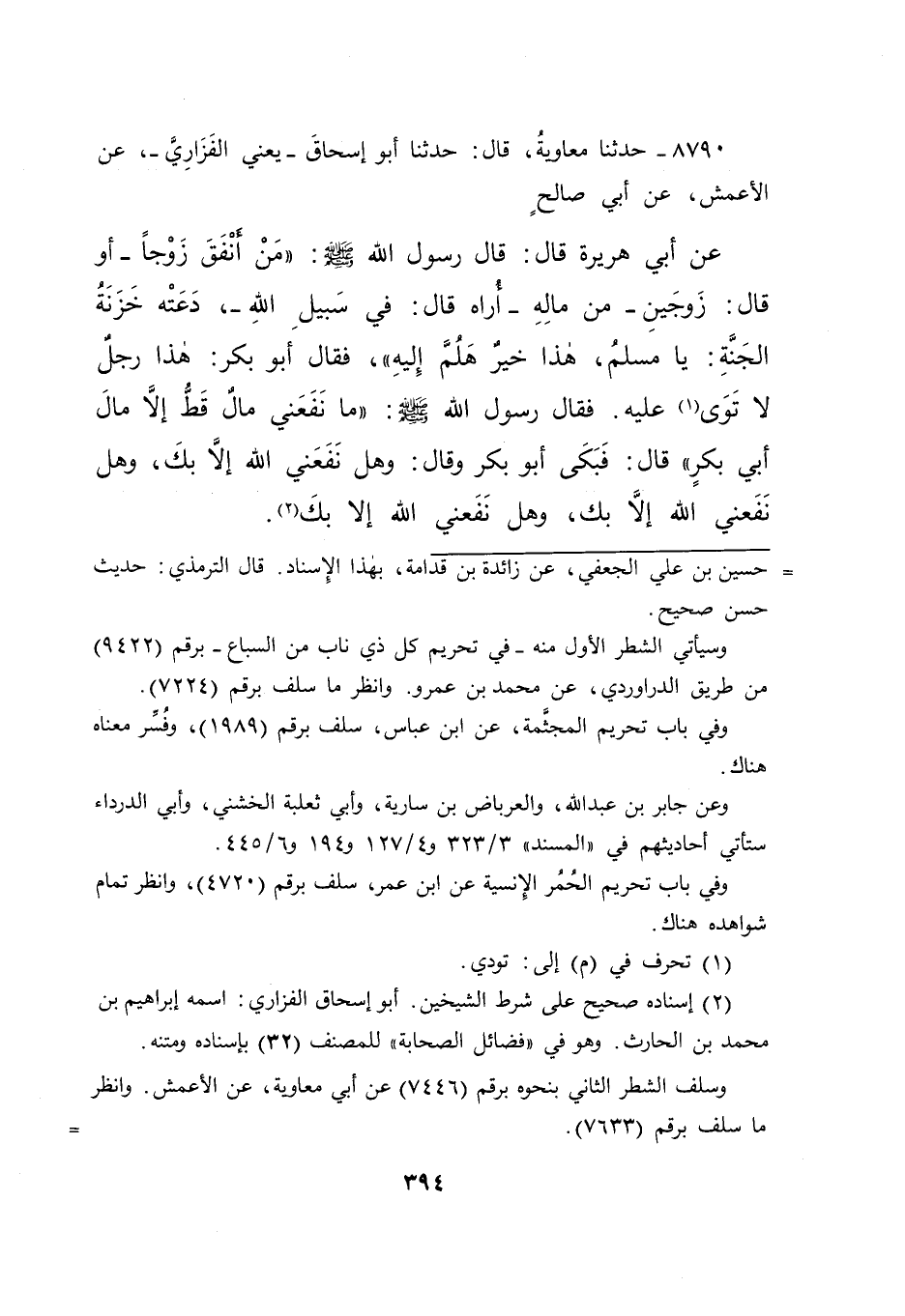 ٨٧٩٠ - حَدَّثَنَا مُعَاوِيَةُ، قَالَ: حَدَّثَنَا أَبُو إِسْحَاقَ يَعْنِي الْفَزَارِيَّ، عَنِ الْأَعْمَشِ، عَنْ أَبِي صَالِحٍ، عَنْ أَبِي هُرَيْرَةَ، قَالَ: قَالَ رَسُولُ اللهِ صَلَّى اللهُ عَلَيْهِ وَسَلَّمَ: " مَنْ أَنْفَقَ زَوْجًا - أَوْ قَالَ زَوْجَيْنِ - مِنْ مَالِهِ - أُرَاهُ قَالَ: فِي سَبِيلِ اللهِ - دَعَتْهُ خَزَنَةُ الْجَنَّةِ: يَا مُسْلِمُ، هَذَا خَيْرٌ هَلُمَّ إِلَيْهِ "، فَقَالَ أَبُو بَكْرٍ: هَذَا رَجُلٌ لَا تُوَى (١) عَلَيْهِ، فَقَالَ رَسُولُ اللهِ صَلَّى اللهُ عَلَيْهِ وَسَلَّمَ: " مَا نَفَعَنِي مَالٌ قَطُّ إِلَّا مَالُ أَبِي بَكْرٍ "، قَالَ: فَبَكَى أَبُو بَكْرٍ، وَقَالَ: وَهَلْ نَفَعَنِي اللهُ إِلَّا بِكَ؟ وَهَلْ نَفَعَنِي اللهُ إِلَّا بِكَ؟ وَهَلْ نَفَعَنِي اللهُ إِلَّا بِكَ؟ (٢)