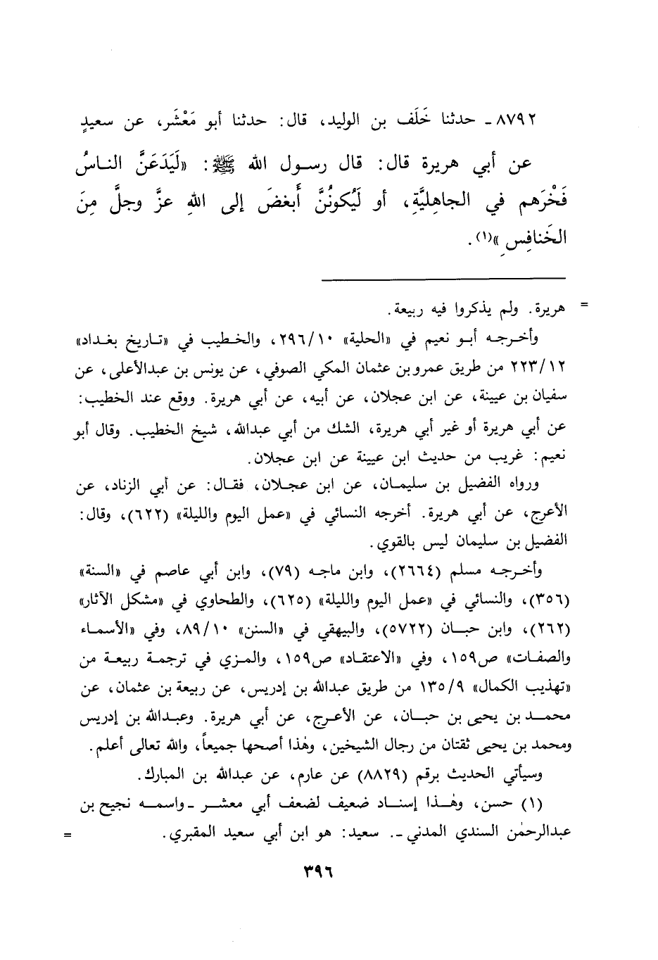 ٨٧٩٢ - حَدَّثَنَا خَلَفُ بْنُ الْوَلِيدِ، قَالَ: حَدَّثَنَا أَبُو مَعْشَرٍ، عَنْ سَعِيدٍ، عَنْ أَبِي هُرَيْرَةَ، قَالَ: قَالَ رَسُولُ اللهِ صَلَّى اللهُ عَلَيْهِ وَسَلَّمَ: " لَيَدَعَنَّ النَّاسُ فَخْرَهُمْ فِي الْجَاهِلِيَّةِ، أَوْ لَيَكُونَنَّ أَبْغَضَ إِلَى اللهِ عَزَّ وَجَلَّ مِنَ الْخَنَافِسِ " (١)