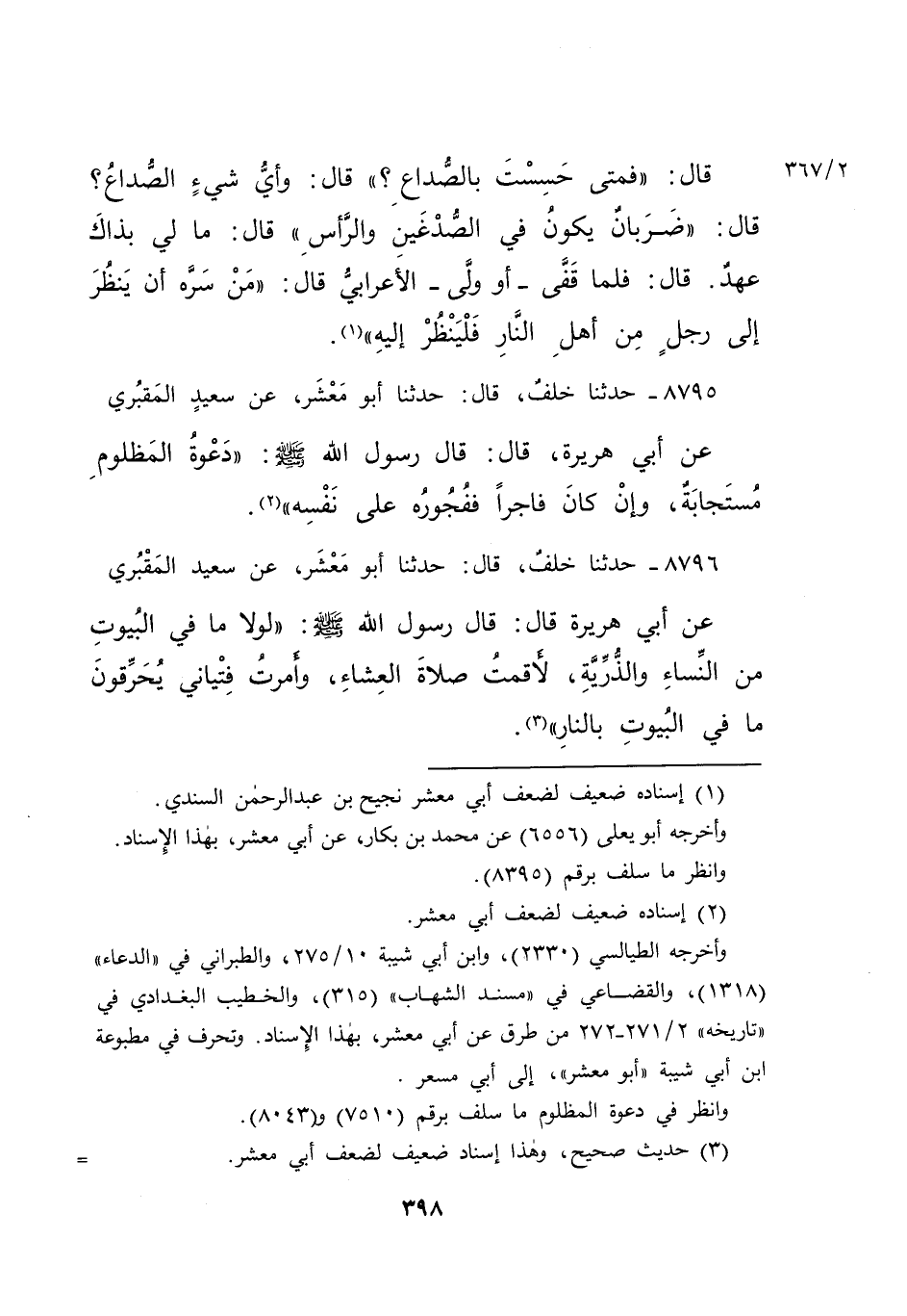 ٨٧٩٥ - حَدَّثَنَا خَلَفٌ، قَالَ: حَدَّثَنَا أَبُو مَعْشَرٍ، عَنْ سَعِيدٍ الْمَقْبُرِيِّ، عَنْ أَبِي هُرَيْرَةَ، قَالَ: قَالَ رَسُولُ اللهِ صَلَّى اللهُ عَلَيْهِ وَسَلَّمَ: " دَعْوَةُ الْمَظْلُومِ مُسْتَجَابَةٌ، وَإِنْ كَانَ فَاجِرًا فَفُجُورُهُ عَلَى نَفْسِهِ " (٢)