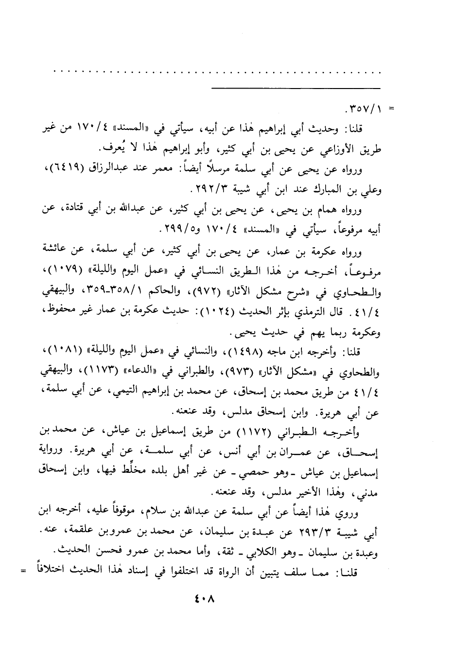 ورواه عكرمة بن عمار، عن يحيى بن أبي كثير، عن أبي سلمة، عن عائشة مرفوعاً، أخرجه من هذا الطريق النسائي في "عمل اليوم والليلة" (١٠٧٩) ، والطحاوي في "شرح مشكل الآثار" (٩٧٢) ، والحاكم ١/٣٥٨-٣٥٩، والبيهقي ٤/٤١. قال الترمذي بإثر الحديث (١٠٢٤) : حديث عكرمة بن عمار غير محفوظ، وعكرمة ربما يهم في حديث يحيى.