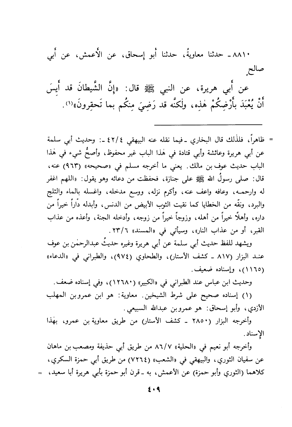 ٨٨١٠ - حَدَّثَنَا مُعَاوِيَةُ، حَدَّثَنَا أَبُو إِسْحَاقَ، عَنِ الْأَعْمَشِ، عَنْ أَبِي صَالِحٍ، عَنْ أَبِي هُرَيْرَةَ، عَنِ النَّبِيِّ صَلَّى اللهُ عَلَيْهِ وَسَلَّمَ قَالَ: " إِنَّ الشَّيْطَانَ قَدْ أَيِسَ أَنْ يُعْبَدَ بِأَرْضِكُمْ هَذِهِ، وَلَكِنَّهُ قَدْ رَضِيَ مِنْكُمْ بِمَا تَحْقِرُونَ " (١)