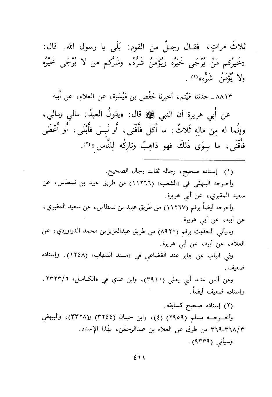 ٨٨١٣ - حَدَّثَنَا هَيْثَمٌ، أَخْبَرَنَا حَفْصُ بْنُ مَيْسَرَةَ، عَنِ الْعَلَاءِ، عَنْ أَبِيهِ، عَنْ أَبِي هُرَيْرَةَ، أَنَّ النَّبِيَّ صَلَّى اللهُ عَلَيْهِ وَسَلَّمَ، قَالَ: " يَقُولُ الْعَبْدُ: مَالِي وَمَالِي، وَإِنَّمَا لَهُ مِنْ مَالِهِ ثَلَاثٌ: مَا أَكَلَ فَأَفْنَى، أَوْ لَبِسَ فَأَبْلَى، أَوْ أَعْطَى فَأَقْنَى، مَا سِوَى ذَلِكَ فَهُوَ ذَاهِبٌ وَتَارِكُهُ لِلنَّاسِ " (٢)