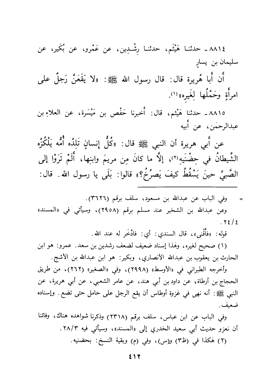 ٨٨١٤ - حَدَّثَنَا هَيْثَمٌ، حَدَّثَنَا رِشْدِينُ، عَنْ عَمْرٍو، عَنْ بُكَيْرٍ، عَنْ سُلَيْمَانَ بْنِ يَسَارٍ، أَنَّ أَبَا هُرَيْرَةَ، قَالَ: قَالَ رَسُولُ اللهِ صَلَّى اللهُ عَلَيْهِ وَسَلَّمَ: " لَا يَقَعَنَّ رَجُلٌ عَلَى امْرَأَةٍ، وَحَمْلُهَا لِغَيْرِهِ " (١)