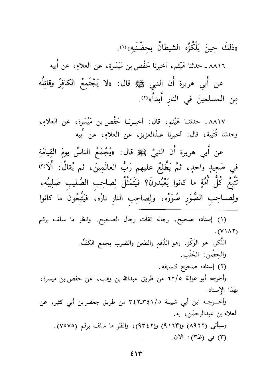 ٨٨١٧ - حَدَّثَنَا هَيْثَمٌ، قَالَ: أَخْبَرَنَا حَفْصُ بْنُ مَيْسَرَةَ، عَنِ الْعَلَاءِ، وحَدَّثَنَا قُتَيْبَةُ، قَالَ: أَخْبَرَنَا عَبْدُ الْعَزِيزِ، عَنِ الْعَلَاءِ، عَنْ أَبِيهِ، عَنْ أَبِي هُرَيْرَةَ، أَنَّ النَّبِيَّ صَلَّى اللهُ عَلَيْهِ وَسَلَّمَ، قَالَ: " يُجْمَعُ النَّاسُ يَوْمَ الْقِيَامَةِ فِي صَعِيدٍ وَاحِدٍ، ثُمَّ يَطْلُعُ عَلَيْهِمْ رَبُّ الْعَالَمِينَ، ثُمَّ يُقَالُ: أَلَا (٣) تَتَّبِعُ كُلُّ أُمَّةٍ مَا كَانُوا يَعْبُدُونَ، فَيَتَمَثَّلُ لِصَاحِبِ الصَّلِيبِ صَلِيبُهُ، وَلِصَاحِبِ الصُّوَرِ صُوَرُهُ، وَلِصَاحِبِ النَّارِ نَارُهُ، فَيَتَّبِعُونَ مَا كَانُوا