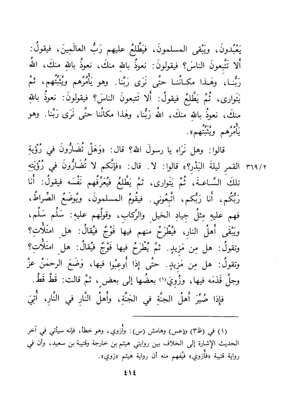 يَعْبُدُونَ، وَيَبْقَى الْمُسْلِمُونَ، فَيَطْلُعُ عَلَيْهِمْ رَبُّ الْعَالَمِينَ، فَيَقُولُ: أَلَا تَتَّبِعُونَ النَّاسَ؟ فَيَقُولُونَ: نَعُوذُ بِاللهِ مِنْكَ، نَعُوذُ بِاللهِ مِنْكَ اللهُ رَبُّنَا، وَهَذَا مَكَانُنَا حَتَّى نَرَى رَبَّنَا، وَهُوَ يَأْمُرُهُمْ، وَيُثَبِّتُهُمْ، ثُمَّ يَتَوَارَى، ثُمَّ يَطْلُعُ، فَيَقُولُ: أَلَا تَتَّبِعُونَ النَّاسَ؟ فَيَقُولُونَ: نَعُوذُ بِاللهِ مِنْكَ، نَعُوذُ بِاللهِ مِنْكَ، اللهُ رَبُّنَا، وَهَذَا مَكَانُنَا حَتَّى نَرَى رَبَّنَا، وَهُوَ يَأْمُرُهُمْ، وَيُثَبِّتُهُمْ "، قَالُوا: وَهَلْ نَرَاهُ يَا رَسُولَ اللهِ؟ قَالَ: " وَهَلْ تُضَارُّونَ فِي رُؤْيَةِ الْقَمَرِ لَيْلَةَ الْبَدْرِ؟ " قَالُوا: لَا، قَالَ: " فَإِنَّكُمْ لَا تُضَارُّونَ فِي رُؤْيَتِهِ تِلْكَ السَّاعَةَ، ثُمَّ يَتَوَارَى، ثُمَّ يَطْلُعُ فَيُعَرِّفُهُمْ نَفْسَهُ، فَيَقُولُ: أَنَا رَبُّكُمْ، أَنَا رَبُّكُمْ، اتَّبِعُونِي، فَيَقُومُ الْمُسْلِمُونَ، وَيُوضَعُ الصِّرَاطُ فَهُمْ عَلَيْهِ مِثْلُ جِيَادِ الْخَيْلِ وَالرِّكَابِ، وَقَوْلُهُمْ عَلَيْهِ: سَلِّمْ سَلِّمْ، وَيَبْقَى أَهْلُ النَّارِ، فَيُطْرَحُ مِنْهُمْ فِيهَا فَوْجٌ، فَيُقَالُ: هَلِ امْتَلَأْتِ؟ وَتَقُولُ: هَلْ مِنْ مَزِيدٍ؟ ثُمَّ يُطْرَحُ فِيهَا فَوْجٌ، فَيُقَالُ: هَلِ امْتَلَأْتِ؟ وَتَقُولُ: هَلْ مِنْ مَزِيدٍ؟ حَتَّى إِذَا أُوعِبُوا فِيهَا، وَضَعَ الرَّحْمَنُ عَزَّ وَجَلَّ قَدَمَهُ فِيهَا، وَزَوَى (١) بَعْضَهَا إِلَى بَعْضٍ، ثُمَّ قَالَتْ: قَطْ، قَطْ،، فَإِذَا صُيِّرَ أَهْلُ الْجَنَّةِ فِي الْجَنَّةِ، وَأَهْلُ النَّارِ فِي النَّارِ، أُتِيَ