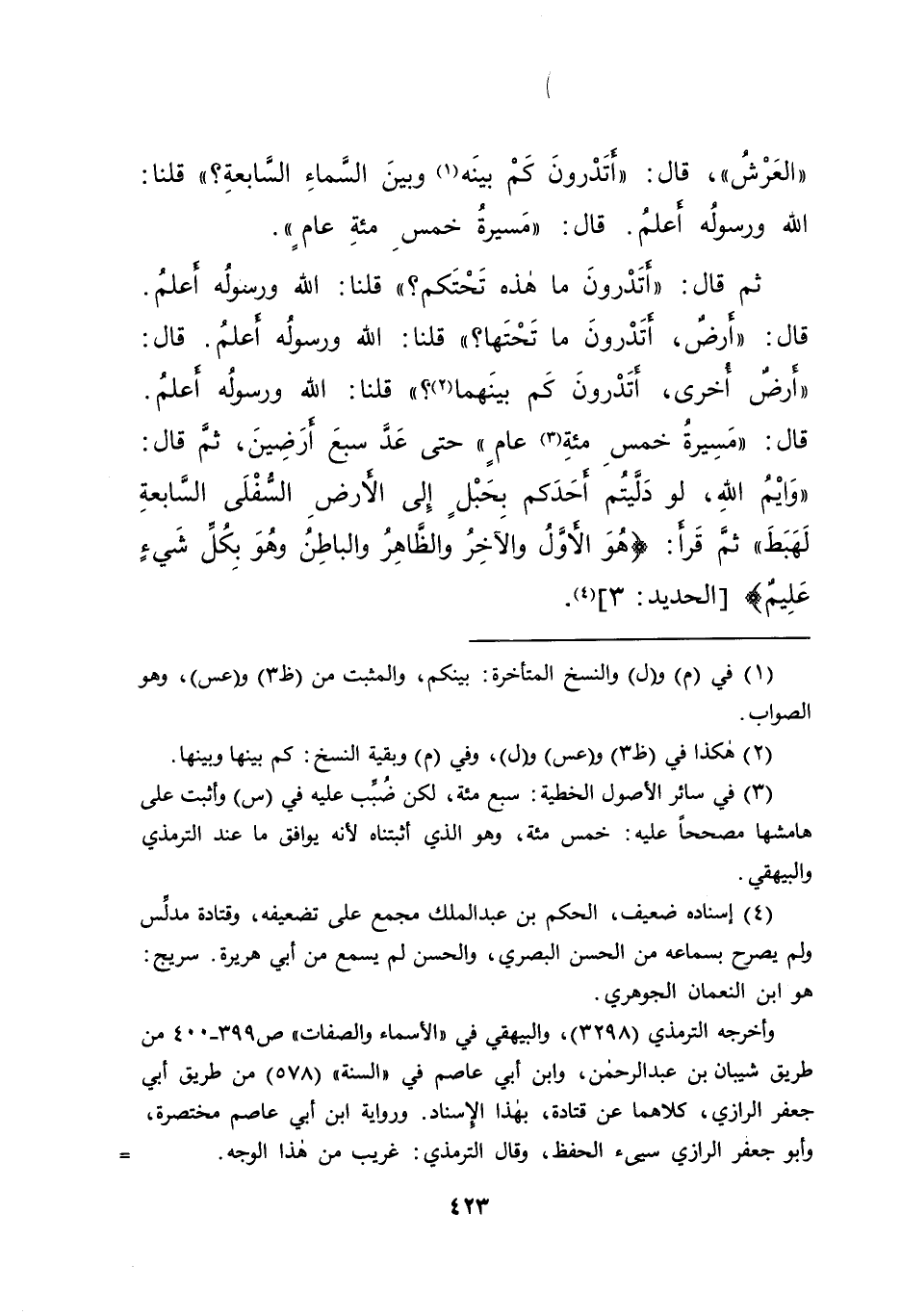الْعَرْشُ "، قَالَ: " أَتَدْرُونَ كَمْ بَيْنَهُ (١) وَبَيْنَ السَّمَاءِ السَّابِعَةِ؟ " قُلْنَا: اللهُ وَرَسُولُهُ أَعْلَمُ، قَالَ: " مَسِيرَةُ خَمْسِ مِائَةِ عَامٍ "، ثُمَّ قَالَ: " أَتَدْرُونَ مَا هَذَا تَحْتَكُمْ؟ " قُلْنَا: اللهُ وَرَسُولُهُ أَعْلَمُ، قَالَ: " أَرْضٌ، أَتَدْرُونَ مَا تَحْتَهَا؟ " قُلْنَا: اللهُ وَرَسُولُهُ أَعْلَمُ، قَالَ: " أَرْضٌ أُخْرَى، أَتَدْرُونَ كَمْ بَيْنَهُمَا (٢) ؟ " قُلْنَا: اللهُ وَرَسُولُهُ أَعْلَمُ، قَالَ: " مَسِيرَةُ خَمْسِ مِائَةِ (٣) عَامٍ حَتَّى عَدَّ سَبْعَ أَرَضِينَ "، ثُمَّ قَالَ: " وَايْمُ اللهِ، لَوْ دَلَّيْتُمْ أَحَدَكُمْ بِحَبْلٍ إِلَى الْأَرْضِ السُّفْلَى السَّابِعَةِ، لَهَبَطَ ثُمَّ قَرَأَ: {هُوَ الْأَوَّلُ وَالْآخِرُ وَالظَّاهِرُ وَالْبَاطِنُ وَهُوَ بِكُلِّ شَيْءٍ عَلِيمٌ} [الحديد: ٣] " (٤)