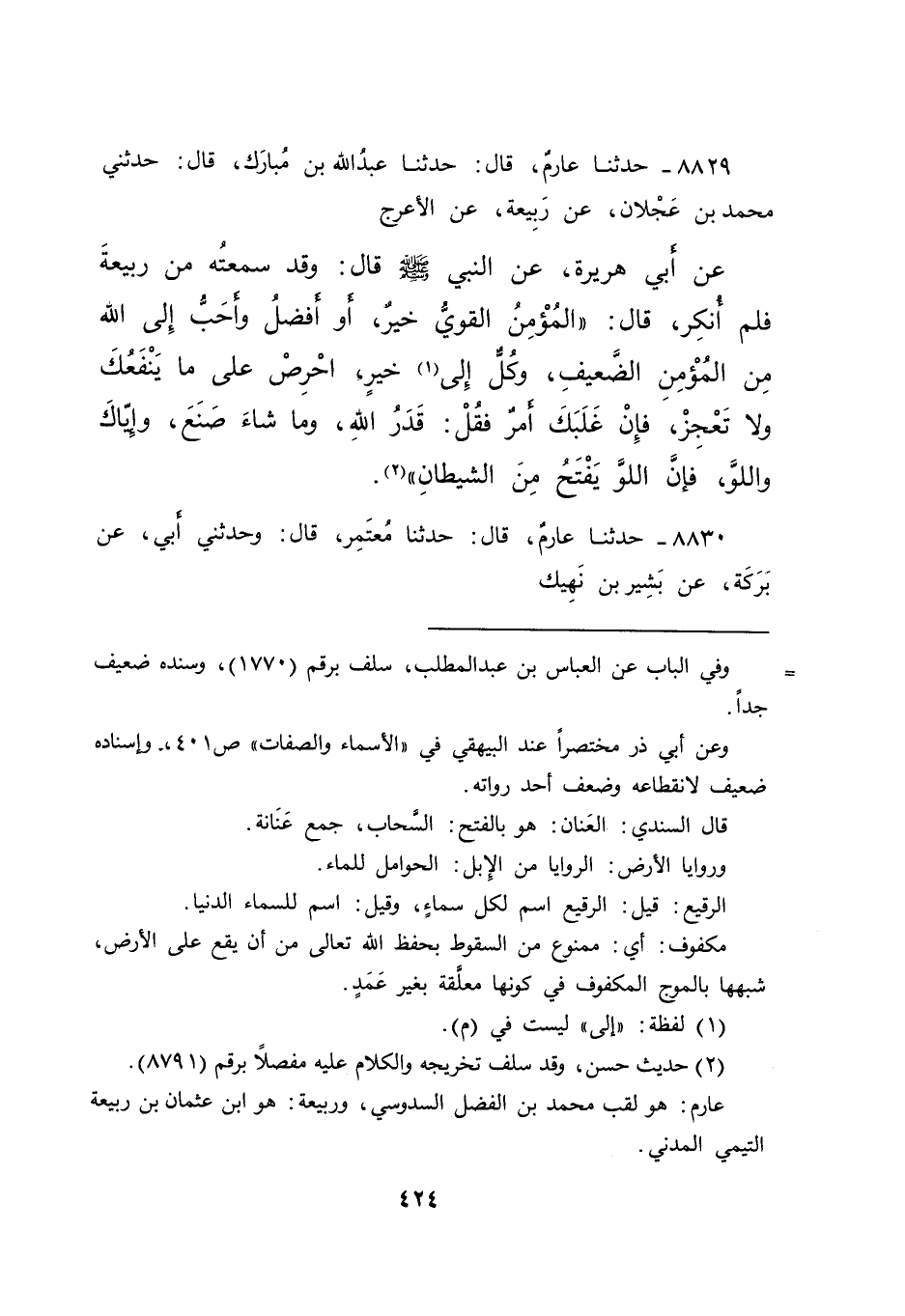 ٨٨٢٩ - حَدَّثَنَا عَارِمٌ، قَالَ: حَدَّثَنَا عَبْدُ اللهِ بْنُ مُبَارَكٍ، قَالَ: حَدَّثَنِي مُحَمَّدُ بْنُ عَجْلَانَ، عَنْ رَبِيعَةَ، عَنِ الْأَعْرَجِ، عَنْ أَبِي هُرَيْرَةَ، عَنِ النَّبِيِّ صَلَّى اللهُ عَلَيْهِ وَسَلَّمَ - قَالَ: وَقَدْ سَمِعْتُهُ مِنْ رَبِيعَةَ فَلَمْ أُنْكِرْ - قَالَ: " الْمُؤْمِنُ الْقَوِيُّ خَيْرٌ أَوْ أَفْضَلُ وَأَحَبُّ إِلَى اللهِ مِنَ الْمُؤْمِنِ الضَّعِيفِ، وَكُلٌّ إِلَى (١) خَيْرٍ احْرِصْ عَلَى مَا يَنْفَعُكَ وَلَا تَعْجِزْ، فَإِنْ غَلَبَكَ أَمْرٌ فَقُلْ: قَدَّرَ اللهُ وَمَا شَاءَ صَنَعَ، وَإِيَّاكَ وَاللَّوَّ، فَإِنَّ اللَّوَّ يُفْتَحُ مِنَ الشَّيْطَانِ " (٢)