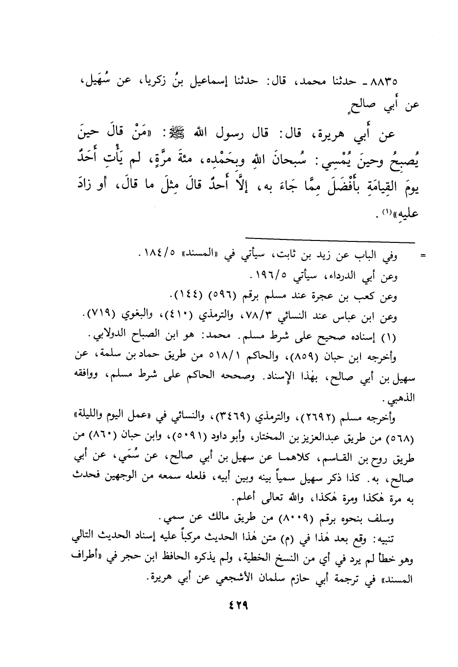 ٨٨٣٥ - حَدَّثَنَا مُحَمَّدٌ، قَالَ حَدَّثَنَا إِسْمَاعِيلُ بْنُ زَكَرِيَّا، عَنْ سُهَيْلِ بْنِ أَبِي صَالِحٍ، عَنْ أَبِي هُرَيْرَةَ، قَالَ: قَالَ رَسُولُ اللهِ صَلَّى اللهُ عَلَيْهِ وَسَلَّمَ: " مَنْ قَالَ حِينَ يُصْبِحُ وَحِينَ يُمْسِي: سُبْحَانَ اللهِ وَبِحَمْدِهِ مِائَةَ مَرَّةٍ، لَمْ يَأْتِ أَحَدٌ يَوْمَ الْقِيَامَةِ بِأَفْضَلَ مِمَّا جَاءَ بِهِ، إِلَّا أَحَدٌ قَالَ مِثْلَ مَا قَالَ، أَوْ زَادَ عَلَيْهِ " (١)