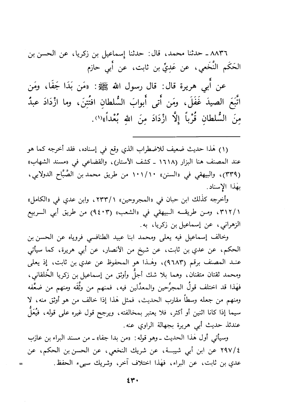 ٨٨٣٦ - حَدَّثَنَا مُحَمَّدٌ، قَالَ: حَدَّثَنَا إِسْمَاعِيلُ بْنُ زَكَرِيَّا، عَنِ الْحَسَنِ بْنِ الْحَكَمِ النَّخَعِيِّ، عَنْ عَدِيِّ بْنِ ثَابِتٍ، عَنْ أَبِي حَازِمٍ، عَنْ أَبِي هُرَيْرَةَ، قَالَ: قَالَ رَسُولُ اللهِ صَلَّى اللهُ عَلَيْهِ وَسَلَّمَ: " مَنْ بَدَا جَفَا، وَمَنِ اتَّبَعَ الصَّيْدَ غَفَلَ، وَمَنْ أَتَى أَبْوَابَ السُّلْطَانِ افْتُتِنَ، وَمَا ازْدَادَ عَبْدٌ مِنَ السُّلْطَانِ قُرْبًا، إِلَّا ازْدَادَ مِنَ اللهِ بُعْدًا " (١)