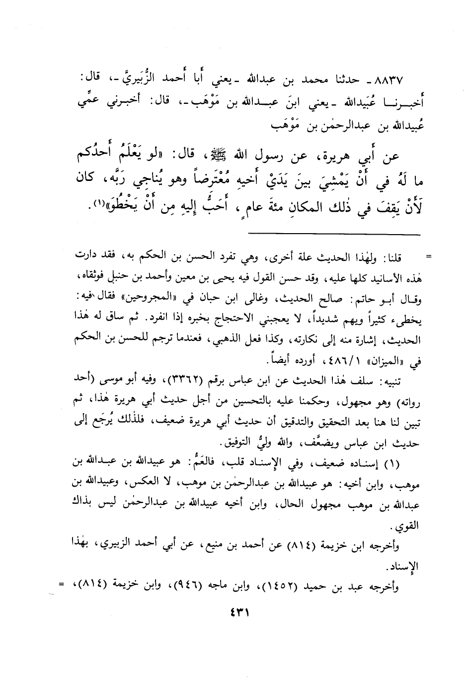 ٨٨٣٧ - حَدَّثَنَا مُحَمَّدُ بْنُ عَبْدِ اللهِ يَعْنِي أَبَا أَحْمَدَ الزُّبَيْرِيَّ، قَالَ: أَخْبَرَنَا عُبَيْدُ اللهِ يَعْنِي ابْنَ عَبْدِ اللهِ بْنِ مَوْهَبٍ، قَالَ: أَخْبَرَنِي عَمِّي عُبَيْدُ اللهِ بْنُ عَبْدِ الرَّحْمَنِ بْنِ مَوْهَبٍ، عَنْ أَبِي هُرَيْرَةَ، عَنْ رَسُولِ اللهِ صَلَّى اللهُ عَلَيْهِ وَسَلَّمَ قَالَ: " لَوْ يَعْلَمُ أَحَدُكُمْ مَا لَهُ فِي أَنْ يَمْشِيَ بَيْنَ يَدَيْ أَخِيهِ مُعْتَرِضًا وَهُوَ يُنَاجِي رَبَّهُ، كَانَ لَأَنْ يَقِفَ فِي ذَلِكَ الْمَكَانِ مِائَةَ عَامٍ، أَحَبَّ إِلَيْهِ مِنْ أَنْ يَخْطُوَ " (١)
