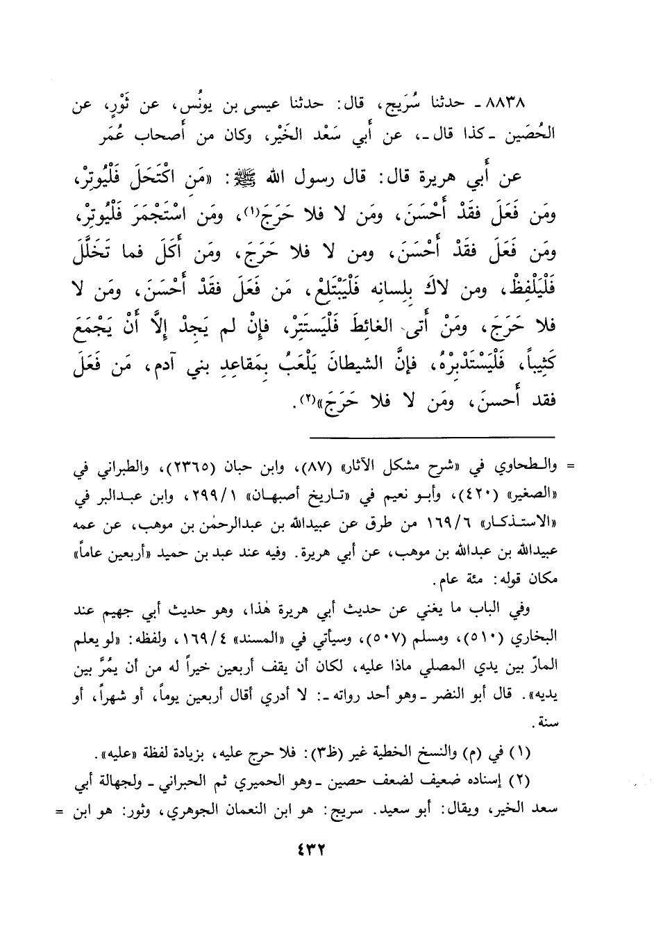 ٨٨٣٨ - حَدَّثَنَا سُرَيْجٌ، قَالَ: حَدَّثَنَا عِيسَى بْنُ يُونُسَ، عَنْ ثَوْرٍ، عَنِ الْحُصَيْنِ - كَذَا قَالَ - عَنْ أَبِي سَعْدِ الْخَيْرِ - وَكَانَ مِنْ أَصْحَابِ عُمَرَ - عَنْ أَبِي هُرَيْرَةَ، قَالَ: قَالَ رَسُولُ اللهِ صَلَّى اللهُ عَلَيْهِ وَسَلَّمَ: " مَنِ اكْتَحَلَ فَلْيُوتِرْ، وَمَنْ فَعَلَ فَقَدْ أَحْسَنَ، وَمَنْ لَا فَلَا حَرَجَ (١) ، وَمَنِ اسْتَجْمَرَ فَلْيُوتِرْ، وَمَنْ فَعَلَ فَقَدْ أَحْسَنَ، وَمَنْ لَا فَلَا حَرَجَ، وَمَنْ أَكَلَ فَمَا تَخَلَّلَ فَلْيَلْفِظْ، وَمَنْ لَاكَ بِلِسَانِهِ فَلْيَبْتَلِعْ، مَنْ فَعَلَ فَقَدْ أَحْسَنَ، وَمَنْ لَا فَلَا حَرَجَ، وَمَنْ أَتَى الْغَائِطَ فَلْيَسْتَتِرْ، فَإِنْ لَمْ يَجِدْ إِلَّا أَنْ يَجْمَعَ كَثِيبًا فَلْيَسْتَدْبِرْهُ، فَإِنَّ الشَّيْطَانَ يَلْعَبُ بِمَقَاعِدِ بَنِي آدَمَ، مَنْ فَعَلَ فَقَدْ أَحْسَنَ، وَمَنْ لَا فَلَا حَرَجَ " (٢)