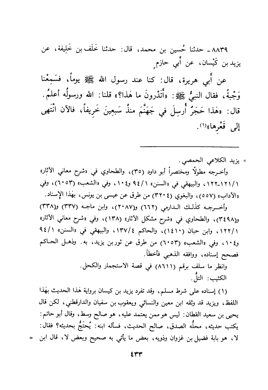 ٨٨٣٩ - حَدَّثَنَا حُسَيْنُ بْنُ مُحَمَّدٍ، قَالَ: حَدَّثَنَا خَلَفُ بْنُ خَلِيفَةَ، عَنْ يَزِيدَ بْنِ كَيْسَانَ، عَنْ أَبِي حَازِمٍ، عَنْ أَبِي هُرَيْرَةَ، قَالَ: كُنَّا عِنْدَ رَسُولِ اللهِ صَلَّى اللهُ عَلَيْهِ وَسَلَّمَ يَوْمًا، فَسَمِعْنَا وَجْبَةً، فَقَالَ النَّبِيُّ صَلَّى اللهُ عَلَيْهِ وَسَلَّمَ: " أَتَدْرُونَ مَا هَذَا؟ " قُلْنَا: اللهُ وَرَسُولُهُ أَعْلَمُ، قَالَ: " هَذَا حَجَرٌ أُرْسِلَ فِي جَهَنَّمَ مُنْذُ سَبْعِينَ خَرِيفًا، فَالْآنَ انْتَهَى إِلَى قَعْرِهَا " (١)