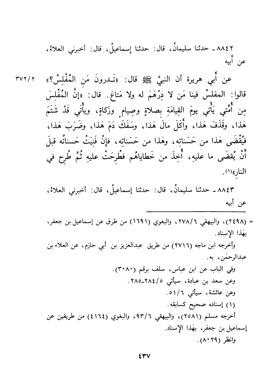 ٨٨٤٢ - حَدَّثَنَا سُلَيْمَانُ، قَالَ: حَدَّثَنَا إِسْمَاعِيلُ، قَالَ: أَخْبَرَنِي الْعَلَاءُ، عَنْ أَبِيهِ، عَنْ أَبِي هُرَيْرَةَ أَنَّ النَّبِيِّ صَلَّى اللهُ عَلَيْهِ وَسَلَّمَ قَالَ: " تَدْرُونَ مَنِ الْمُفْلِسُ؟ "، قَالُوا: الْمُفْلِسُ فِينَا مَنْ لَا دِرْهَمَ لَهُ وَلَا مَتَاعَ، قَالَ: " إِنَّ الْمُفْلِسَ مِنْ أُمَّتِي يَأْتِي يَوْمَ الْقِيَامَةِ بِصَلَاةٍ وَصِيَامٍ وَزَكَاةٍ، وَيَأْتِي قَدْ شَتَمَ هَذَا، وَقَذَفَ هَذَا، وَأَكَلَ مَالَ هَذَا، وَسَفَكَ دَمَ هَذَا، وَضَرَبَ هَذَا، فَيُقْضَى هَذَا مِنْ حَسَنَاتِهِ، وَهَذَا مِنْ حَسَنَاتِهِ، فَإِنْ فَنِيَتْ حَسَنَاتُهُ قَبْلَ أَنْ يَقْضِيَ مَا عَلَيْهِ، أُخِذَ مِنْ خَطَايَاهُمْ، فَطُرِحَتْ عَلَيْهِ، ثُمَّ طُرِحَ فِي النَّارِ " (١)