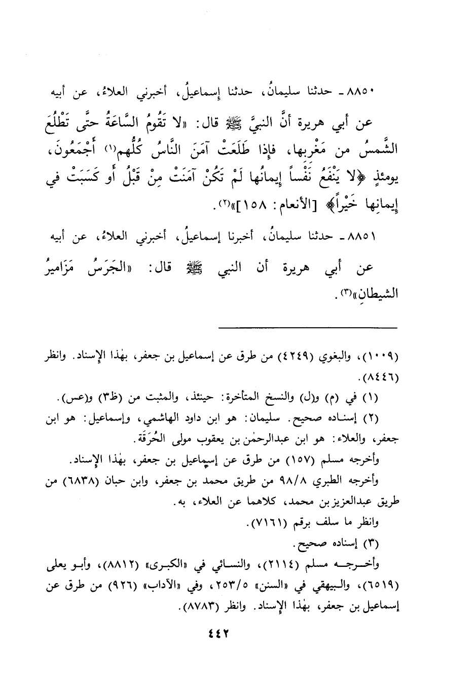 ٨٨٥٠ - حَدَّثَنَا سُلَيْمَانُ، حَدَّثَنَا إِسْمَاعِيلُ، أَخْبَرَنِي الْعَلَاءُ، عَنْ أَبِيهِ، عَنْ أَبِي هُرَيْرَةَ، أَنَّ النَّبِيَّ صَلَّى اللهُ عَلَيْهِ وَسَلَّمَ قَالَ: " لَا تَقُومُ السَّاعَةُ حَتَّى تَطْلُعَ الشَّمْسُ مِنْ مَغْرِبِهَا، فَإِذَا طَلَعَتْ آمَنَ النَّاسُ كُلُّهُمْ (١) أَجْمَعُونَ، يَوْمَئِذٍ {لَا يَنْفَعُ نَفْسًا إِيمَانُهَا لَمْ تَكُنْ آمَنَتْ مِنْ قَبْلُ أَوْ كَسَبَتْ فِي إِيمَانِهَا خَيْرًا} [الأنعام: ١٥٨] " (٢)