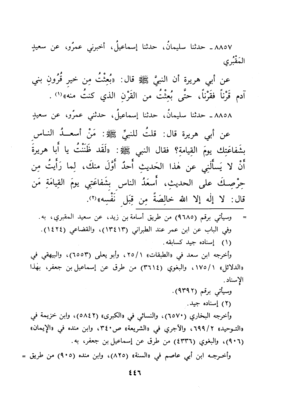 ٨٨٥٨ - حَدَّثَنَا سُلَيْمَانُ، حَدَّثَنَا إِسْمَاعِيلُ، حَدَّثَنِي عَمْرٌو، عَنْ سَعِيدٍ، عَنْ أَبِي هُرَيْرَةَ، قَالَ: قُلْتُ لِلنَّبِيِّ صَلَّى اللهُ عَلَيْهِ وَسَلَّمَ: مَنْ أَسْعَدُ النَّاسِ بِشَفَاعَتِكَ يَوْمَ الْقِيَامَةِ؟ فَقَالَ النَّبِيُّ صَلَّى اللهُ عَلَيْهِ وَسَلَّمَ: " لَقَدْ ظَنَنْتُ يَا أَبَا هُرَيْرَةَ، أَلَّا يَسْأَلَنِي عَنْ هَذَا الْحَدِيثِ أَحَدٌ أَوَّلَ مِنْكَ، لِمَا رَأَيْتُ مِنْ حِرْصِكَ عَلَى الْحَدِيثِ، أَسْعَدُ النَّاسِ بِشَفَاعَتِي يَوْمَ الْقِيَامَةِ مَنْ قَالَ: لَا إِلَهَ إِلَّا اللهُ خَالِصَةً مِنْ قِبَلِ نَفْسِهِ " (٢)