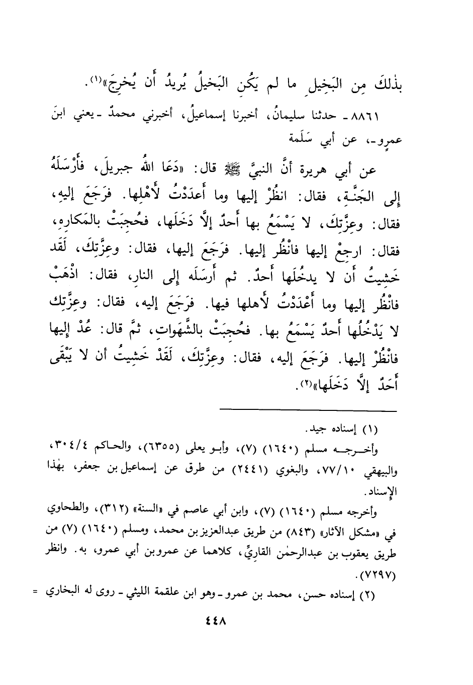 ٨٨٦١ - حَدَّثَنَا سُلَيْمَانُ، أَخْبَرَنَا إِسْمَاعِيلُ، أَخْبَرَنِي مُحَمَّدٌ يَعْنِي ابْنَ عَمْرٍو، عَنْ أَبِي سَلَمَةَ، عَنْ أَبِي هُرَيْرَةَ، أَنَّ النَّبِيَّ صَلَّى اللهُ عَلَيْهِ وَسَلَّمَ قَالَ: " دَعَا اللهُ جِبْرِيلَ فَأَرْسَلَهُ إِلَى الْجَنَّةِ، فَقَالَ: انْظُرْ إِلَيْهَا وَمَا أَعْدَدْتُ لِأَهْلِهَا، فَرَجَعَ إِلَيْهِ، فَقَالَ: وَعِزَّتِكَ، لَا يَسْمَعُ بِهَا أَحَدٌ إِلَّا دَخَلَهَا، فَحُجِبَتْ بِالْمَكَارِهِ، فَقَالَ: ارْجِعْ إِلَيْهَا فَانْظُرْ إِلَيْهَا، فَرَجَعَ إِلَيْهَا، فَقَالَ: وَعِزَّتِكَ، لَقَدْ خَشِيتُ أَلَّا يَدْخُلَهَا أَحَدٌ، ثُمَّ أَرْسَلَهُ إِلَى النَّارِ، فَقَالَ: اذْهَبْ فَانْظُرْ إِلَيْهَا وَمَا أَعْدَدْتُ لِأَهْلِهَا فِيهَا، فَرَجَعَ إِلَيْهِ، فَقَالَ: وَعِزَّتِكَ، لَا يَدْخُلُهَا أَحَدٌ يَسْمَعُ بِهَا، فَحُجِبَتْ بِالشَّهَوَاتِ، ثُمَّ قَالَ: عُدْ إِلَيْهَا فَانْظُرْ إِلَيْهَا، فَرَجَعَ إِلَيْهِ، فَقَالَ: وَعِزَّتِكَ، لَقَدْ خَشِيتُ أَنْ لَا يَبْقَى أَحَدٌ إِلَّا دَخَلَهَا " (٢)