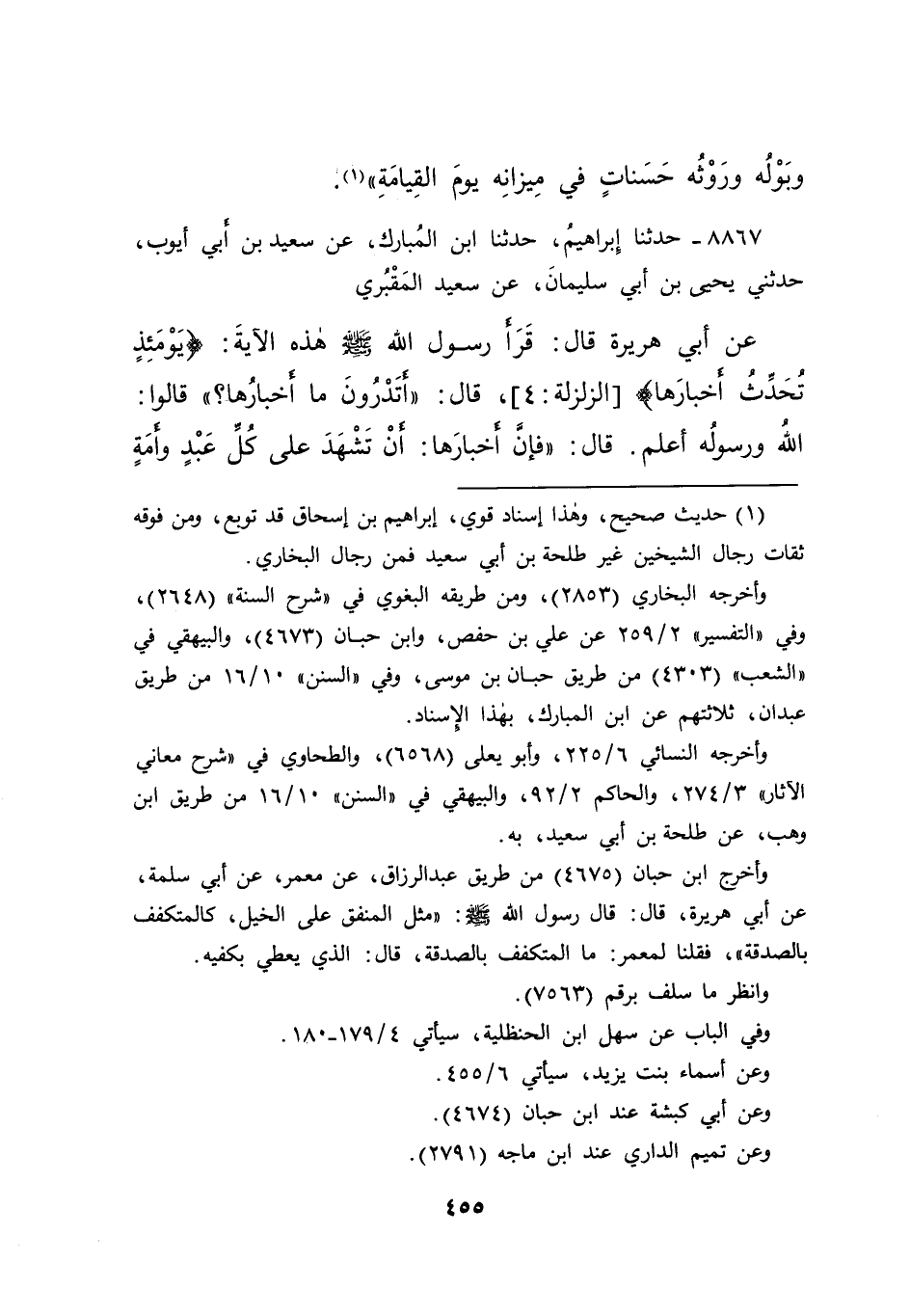 ٨٨٦٧ - حَدَّثَنَا إِبْرَاهِيمُ، حَدَّثَنَا ابْنُ مُبَارَكٍ، عَنْ سَعِيدِ بْنِ أَبِي أَيُّوبَ، حَدَّثَنِي يَحْيَى بْنُ أَبِي سُلَيْمَانَ، عَنْ سَعِيدٍ الْمَقْبُرِيِّ، عَنْ أَبِي هُرَيْرَةَ، قَالَ: قَرَأَ رَسُولُ اللهِ صَلَّى اللهُ عَلَيْهِ وَسَلَّمَ هَذِهِ الْآيَةَ: {يَوْمَئِذٍ تُحَدِّثُ أَخْبَارَهَا} [الزلزلة: ٤] ، قَالَ: " أَتَدْرُونَ مَا أَخْبَارُهَا؟ " قَالُوا: اللهُ وَرَسُولُهُ أَعْلَمُ، قَالَ: " فَإِنَّ أَخْبَارَهَا أَنْ تَشْهَدَ عَلَى كُلِّ عَبْدٍ وَأَمَةٍ
