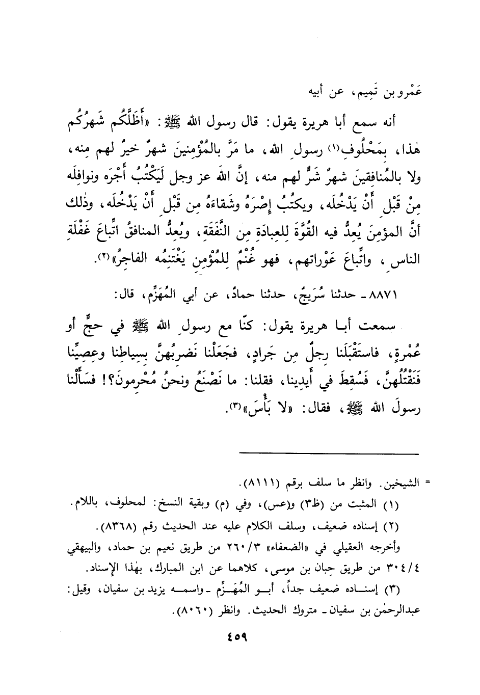عَمْرُو بْنُ تَمِيمٍ، عَنْ أَبِيهِ، أَنَّهُ سَمِعَ أَبَا هُرَيْرَةَ، يَقُولُ: قَالَ رَسُولُ اللهِ صَلَّى اللهُ عَلَيْهِ وَسَلَّمَ: " أَظَلَّكُمْ شَهْرُكُمْ هَذَا بِمَحْلُوفِ (١) رَسُولِ اللهِ، مَا مَرَّ بِالْمُؤْمِنِينَ شَهْرٌ خَيْرٌ لَهُمْ مِنْهُ، وَلَا بِالْمُنَافِقِينَ شَهْرٌ شَرٌّ لَهُمْ مِنْهُ، إِنَّ اللهَ عَزَّ وَجَلَّ لَيَكْتُبُ أَجْرَهُ وَنَوَافِلَهُ مِنْ قَبْلِ أَنْ يُدْخِلَهُ، وَيَكْتُبُ إِصْرَهُ وَشَقَاءَهُ مِنْ قَبْلِ أَنْ يُدْخِلَهُ، وَذَلِكَ أَنَّ الْمُؤْمِنَ يُعِدُّ فِيهِ الْقُوَّةَ لِلْعِبَادَةِ مِنَ النَّفَقَةِ، وَيُعِدُّ الْمُنَافِقُ اتِّبَاعَ غَفْلَةِ النَّاسِ، وَاتِّبَاعَ عَوْرَاتِهِمْ، فَهُوَ غُنْمٌ لِلْمُؤْمِنِ يَغْتَنِمُهُ الْفَاجِرُ " (٢)
