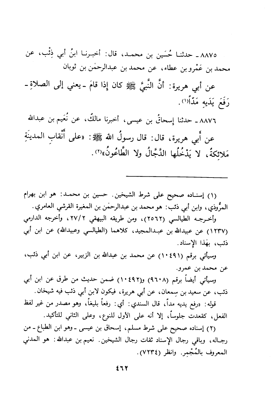 ٨٨٧٥ - حَدَّثَنَا حُسَيْنُ بْنُ مُحَمَّدٍ، قَالَ: أَخْبَرَنَا ابْنُ أَبِي ذِئْبٍ، عَنْ مُحَمَّدِ بْنِ عَمْرِو بْنِ عَطَاءٍ، عَنْ مُحَمَّدِ بْنِ عَبْدِ الرَّحْمَنِ بْنِ ثَوْبَانَ، عَنْ أَبِي هُرَيْرَةَ، " أَنَّ النَّبِيَّ صَلَّى اللهُ عَلَيْهِ وَسَلَّمَ، كَانَ إِذَا قَامَ يَعْنِي إِلَى الصَّلَاةِ، رَفَعَ يَدَيْهِ مَدًّا " (١)