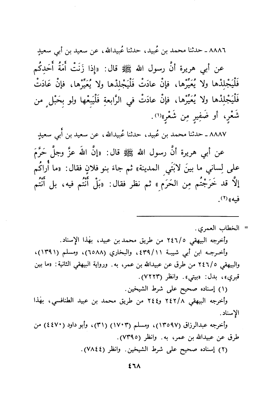 ٨٨٨٦ - حَدَّثَنَا مُحَمَّدُ بْنُ عُبَيْدٍ، حَدَّثَنَا عُبَيْدُ اللهِ، عَنْ سَعِيدِ بْنِ أَبِي سَعِيدٍ، عَنْ أَبِي هُرَيْرَةَ، أَنَّ رَسُولَ اللهِ صَلَّى اللهُ عَلَيْهِ وَسَلَّمَ قَالَ: " إِذَا زَنَتْ أَمَةُ أَحَدِكُمْ فَلْيَجْلِدْهَا وَلَا يُعَيِّرْهَا، فَإِنْ عَادَتْ فَلْيَجْلِدْهَا وَلَا يُعَيِّرْهَا، فَإِنْ عَادَتْ فَلْيَجْلِدْهَا وَلَا يُعَيِّرْهَا، فَإِنْ عَادَتْ فِي الرَّابِعَةِ فَلْيَبِعْهَا وَلَوْ بِحَبْلٍ مِنْ شَعَرٍ، أَوْ ضَفِيرٍ مِنْ شَعَرٍ " (١)
