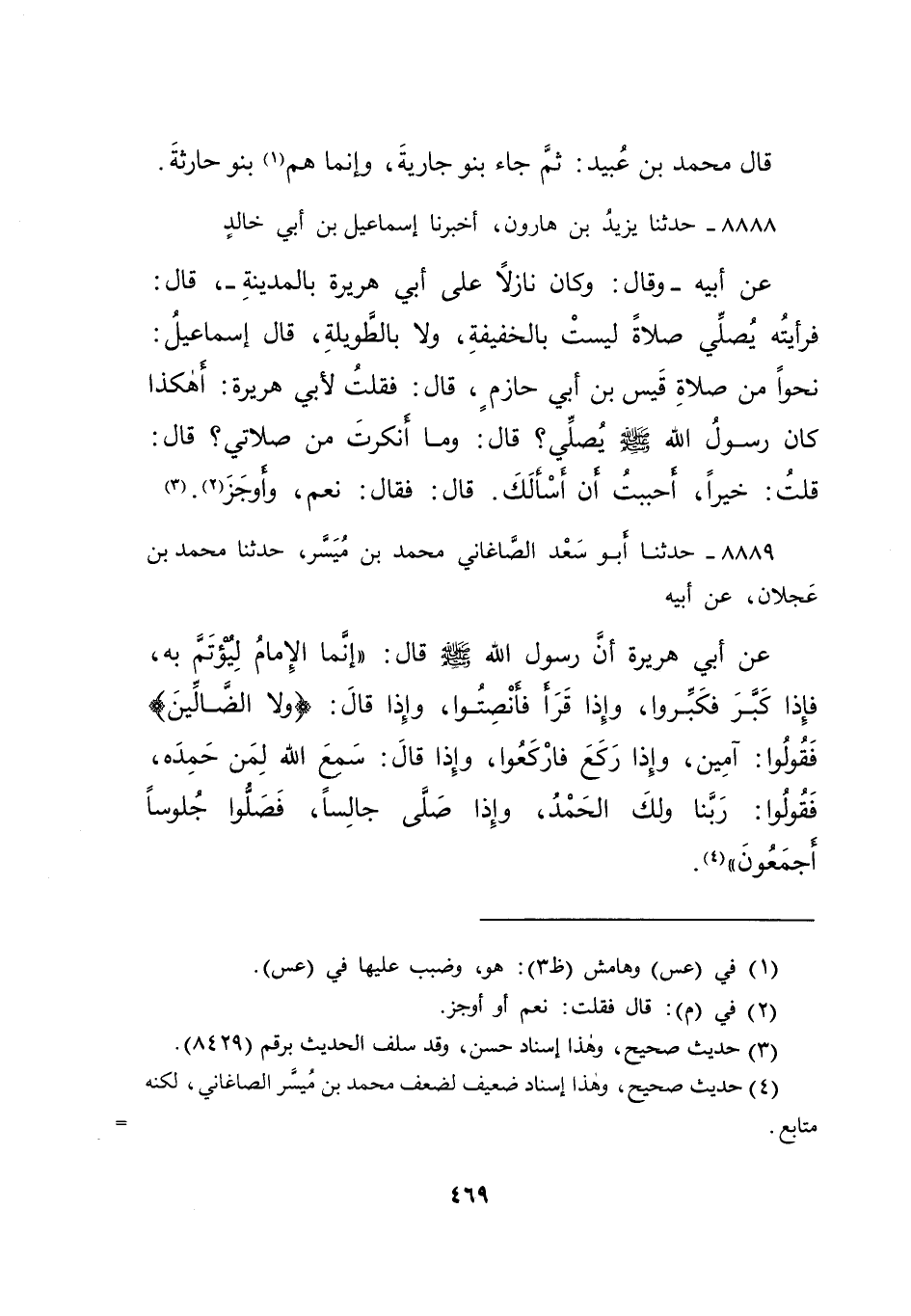 ٨٨٨٩ - حَدَّثَنَا أَبُو سَعْدٍ الصَّاغَانِيُّ مُحَمَّدُ بْنُ مُيَسَّرٍ، حَدَّثَنَا مُحَمَّدُ بْنُ عَجْلَانَ، عَنْ أَبِيهِ، عَنْ أَبِي هُرَيْرَةَ، أَنَّ رَسُولَ اللهِ صَلَّى اللهُ عَلَيْهِ وَسَلَّمَ قَالَ: " إِنَّمَا الْإِمَامُ لِيُؤْتَمَّ بِهِ، فَإِذَا كَبَّرَ فَكَبِّرُوا، وَإِذَا قَرَأَ فَأَنْصِتُوا، وَإِذَا قَالَ: {وَلَا الضَّالِّينَ} [الفاتحة: ٧] ، فَقُولُوا: آمِينَ، وَإِذَا رَكَعَ فَارْكَعُوا، وَإِذَا قَالَ: سَمِعَ اللهُ لِمَنْ حَمِدَهُ، فَقُولُوا: رَبَّنَا وَلَكَ الْحَمْدُ، وَإِذَا صَلَّى جَالِسًا، فَصَلُّوا جُلُوسًا أَجْمَعُونَ " (٤)