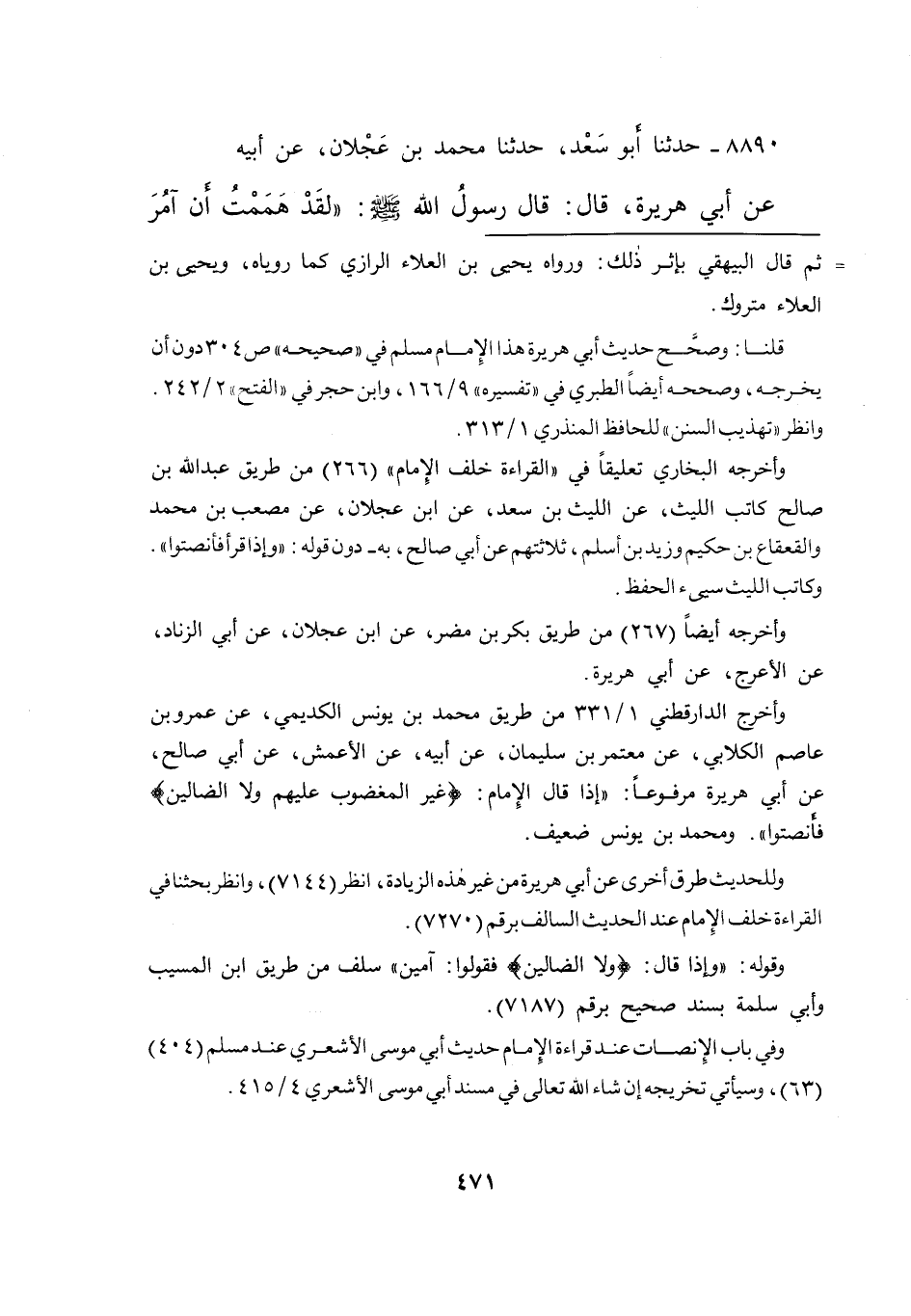 وأخرج الدارقطني ١/٣٣١ من طريق محمد بن يونس الكديمي، عن عمرو بن عاصم الكلابي، عن معتمر بن سليمان، عن أبيه، عن الأعمش، عن أبي صالح، عن أبي هريرة مرفوعاً: "إذا قال الِإمام: (غير المغضوب عليهم ولا الضالين) فأنصتوا". ومحمد بن يونس ضعيف.