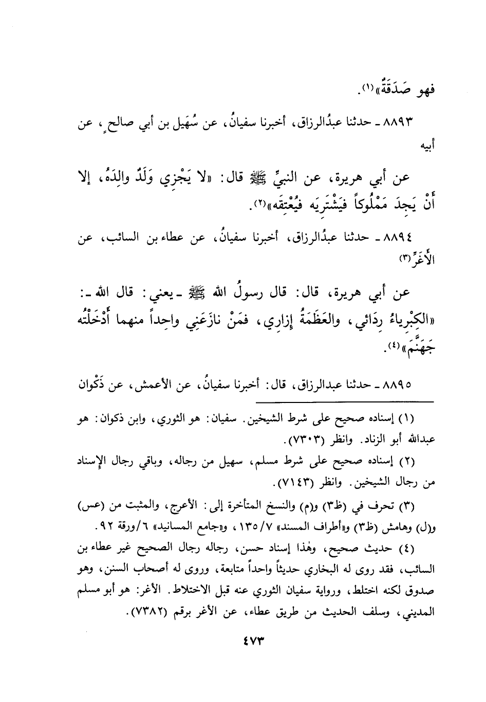 ٨٨٩٣ - حَدَّثَنَا عَبْدُ الرَّزَّاقِ، أَخْبَرَنَا سُفْيَانُ، عَنْ سُهَيْلِ بْنِ أَبِي صَالِحٍ، عَنْ أَبِيهِ، عَنْ أَبِي هُرَيْرَةَ، عَنِ النَّبِيِّ صَلَّى اللهُ عَلَيْهِ وَسَلَّمَ قَالَ: " لَا يَجْزِي وَلَدٌ وَالِدَهُ، إِلَّا أَنْ يَجِدَهُ مَمْلُوكًا فَيَشْتَرِيَهُ فَيُعْتِقَهُ " (٢)