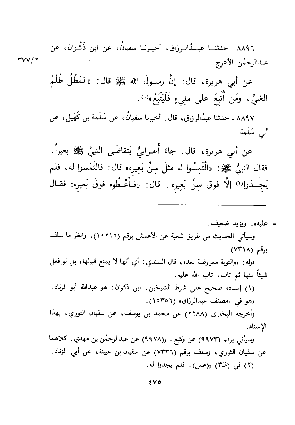 ٨٨٩٧ - حَدَّثَنَا عَبْدُ الرَّزَّاقِ، قَالَ: أَخْبَرَنَا سُفْيَانُ، عَنْ سَلَمَةَ بْنِ كُهَيْلٍ، عَنْ أَبِي سَلَمَةَ، عَنْ أَبِي هُرَيْرَةَ، قَالَ: جَاءَ أَعْرَابِيٌّ يَتَقَاضَى النَّبِيَّ صَلَّى اللهُ عَلَيْهِ وَسَلَّمَ بَعِيرًا، فَقَالَ النَّبِيُّ صَلَّى اللهُ عَلَيْهِ وَسَلَّمَ: " الْتَمِسُوا لَهُ مِثْلَ سِنِّ بَعِيرِهِ "، قَالَ: فَالْتَمَسُوا لَهُ، فَلَمْ يَجِدُوا (٢) إِلَّا فَوْقَ سِنِّ بَعِيرِهِ، قَالَ: فَأَعْطُوهُ فَوْقَ بَعِيرِهِ، فَقَالَ