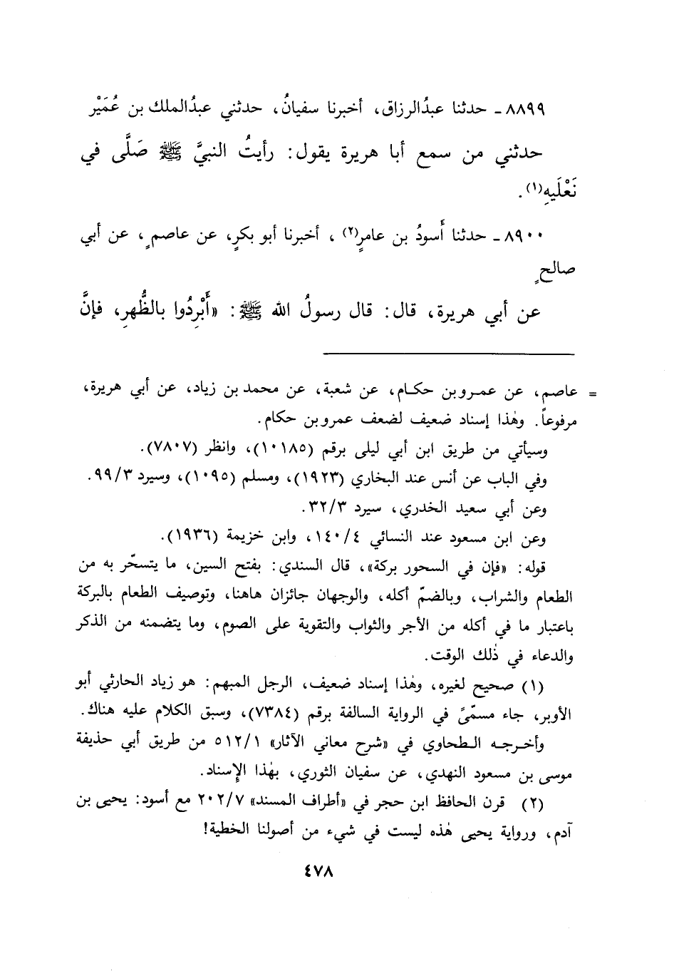 ٨٩٠٠ - حَدَّثَنَا أَسْوَدُ بْنُ عَامِرٍ (٢) ، أَخْبَرَنَا أَبُو بَكْرٍ، عَنْ عَاصِمٍ، عَنْ أَبِي صَالِحٍ، عَنْ أَبِي هُرَيْرَةَ، قَالَ: قَالَ رَسُولُ اللهِ صَلَّى اللهُ عَلَيْهِ وَسَلَّمَ: " أَبْرِدُوا بِالظُّهْرِ، فَإِنَّ