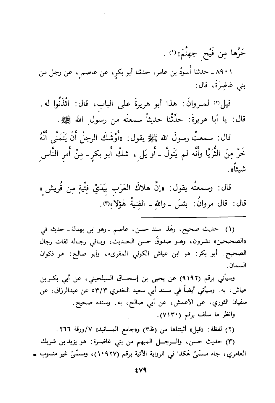 ٨٩٠١ - حَدَّثَنَا أَسْوَدُ بْنُ عَامِرٍ، حَدَّثَنَا أَبُو بَكْرٍ، عَنْ عَاصِمٍ، عَنْ رَجُلٍ مِنْ بَنِي غَاضِرَةَ، قَالَ: قِيلَ (٢) لِمَرْوَانَ: هَذَا أَبُو هُرَيْرَةَ عَلَى الْبَابِ، قَالَ: ائْذَنُوا لَهُ، قَالَ: يَا أَبَا هُرَيْرَةَ، حَدِّثْنَا حَدِيثًا سَمِعْتَهُ مِنْ رَسُولِ اللهِ صَلَّى اللهُ عَلَيْهِ وَسَلَّمَ، قَالَ: سَمِعْتُ رَسُولَ اللهِ صَلَّى اللهُ عَلَيْهِ وَسَلَّمَ يَقُولُ: " أَوْشَكَ الرَّجُلُ أَنْ يَتَمَنَّى أَنَّهُ خَرَّ مِنَ الثُّرَيَّا، وَأَنَّهُ لَمْ يَتَوَلَّ - أَوْ يَلِ، شَكَّ أَبُو بَكْرٍ - مِنْ أَمْرِ النَّاسِ شَيْئًا "